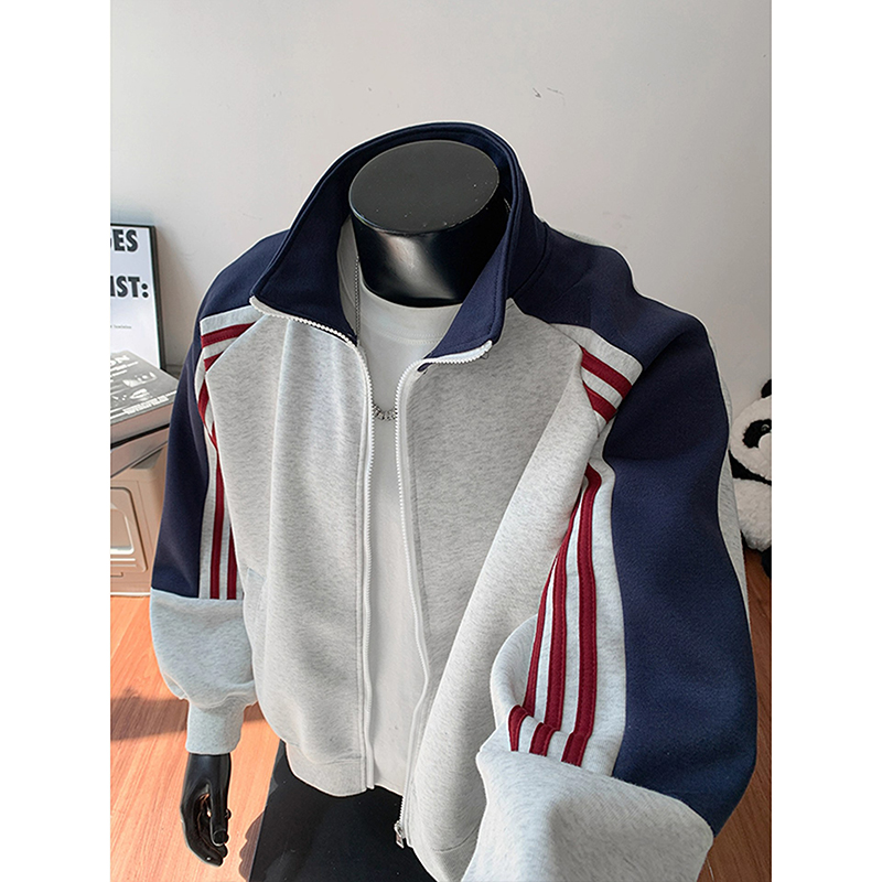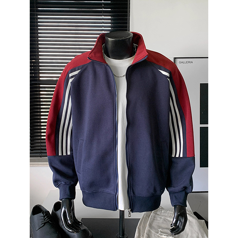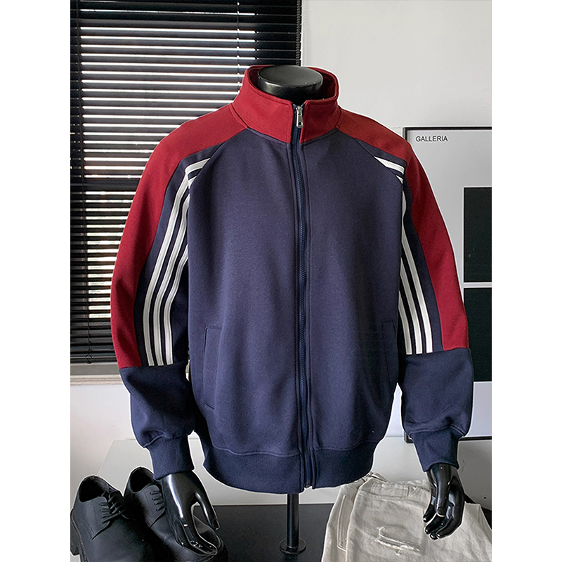 颖膝美式复古拼色条纹立领卫衣男