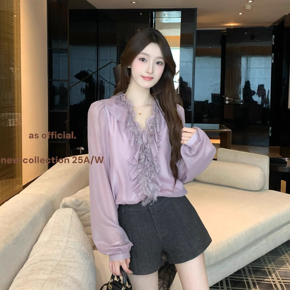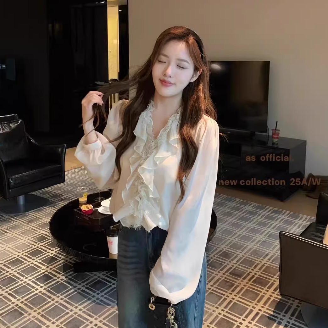 法式重工荷叶边雪纺衬衫女早秋宽松衬衣设计感小众高级感气质上衣