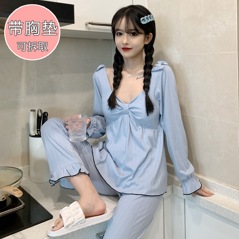 睡衣女春秋季长袖带胸垫bra性感公主风纯棉秋冬款学生家居服套装