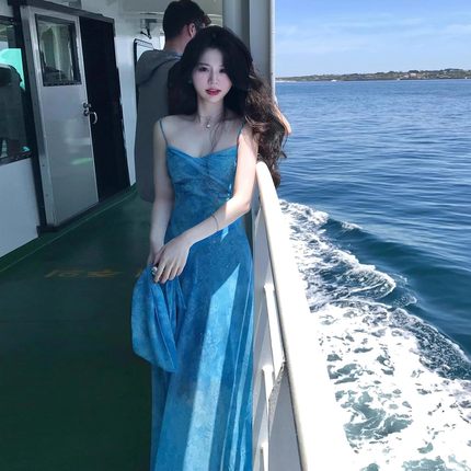 夏日绝美度假风法式设计感扎染蓝色吊带连衣裙女2025夏季新款长裙