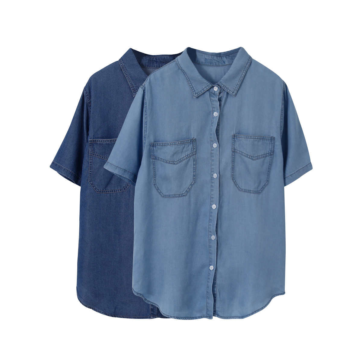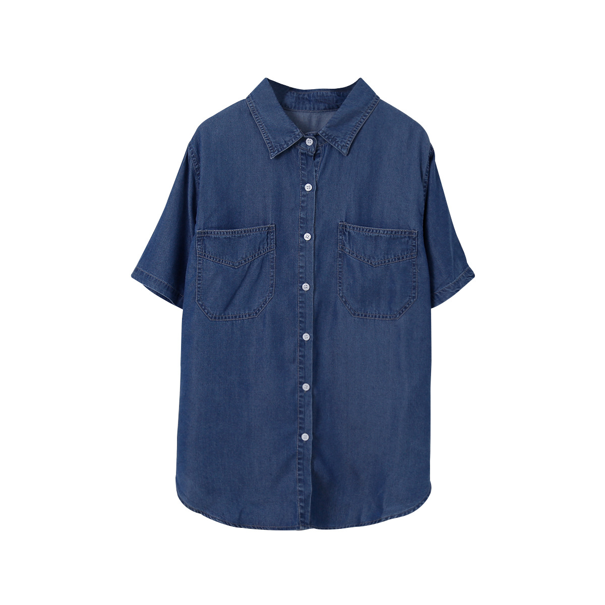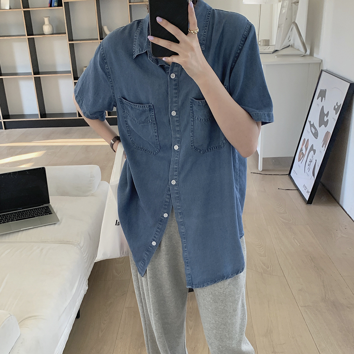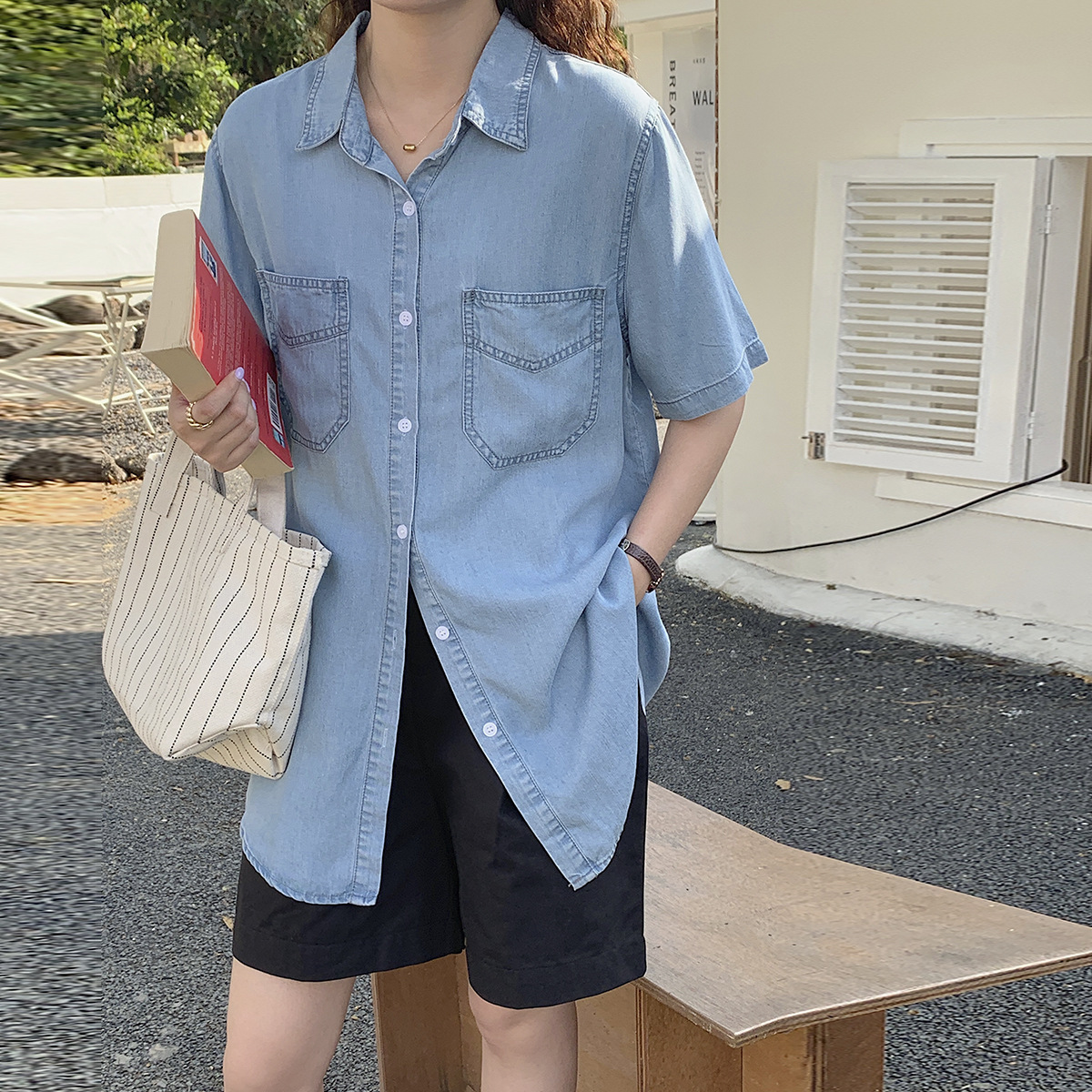 水洗蓝短袖牛仔衬衫女设计感2025新款中长款宽松上衣8652强明女装