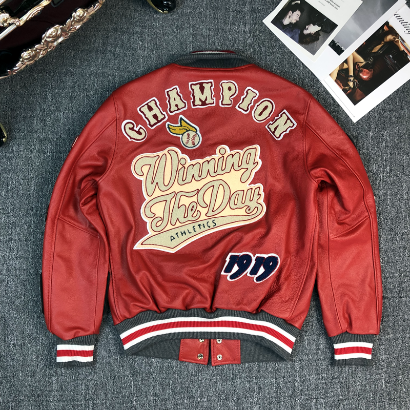 棒球服男春秋新款真皮皮衣红色重工刺绣夹克宽松外套头层牛皮上衣