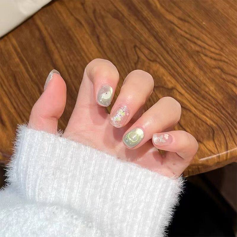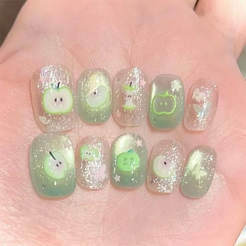 春日苹果冰酒碎碎冰爆闪猫眼穿戴甲短款显白渐变绿色精致立体感