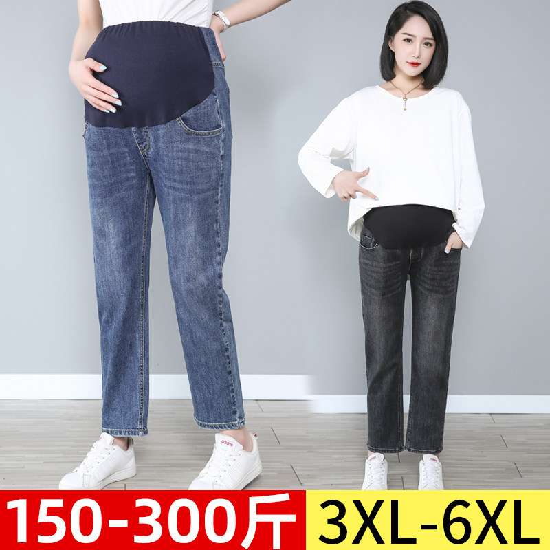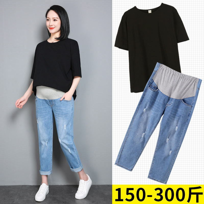 加肥大码200斤孕妇牛仔裤打底裤子春秋薄款外穿破洞九分裤老爹裤