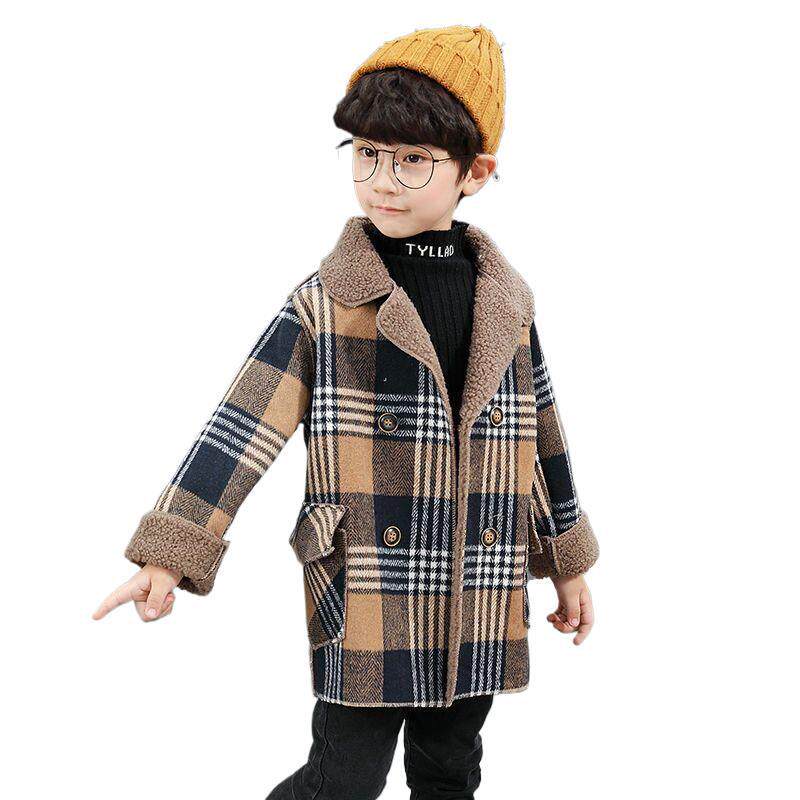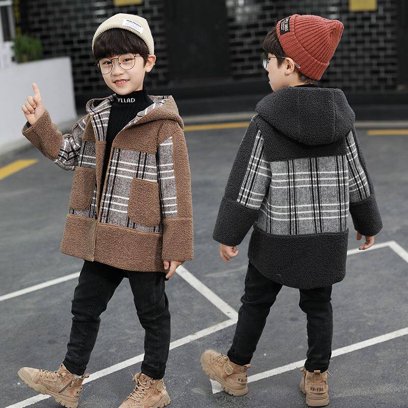 男童加绒加厚外套2025秋冬款儿童装格子毛呢子大衣韩版中长款上衣
