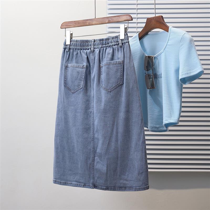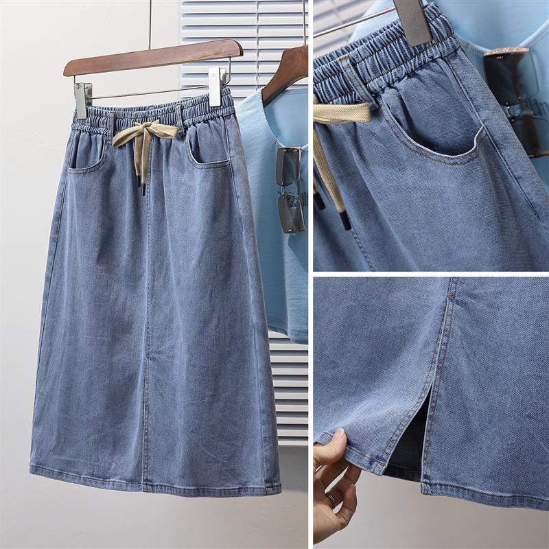天丝牛仔半身裙女夏薄款大码胖mm梨型身材显瘦高腰开叉a字包臀裙