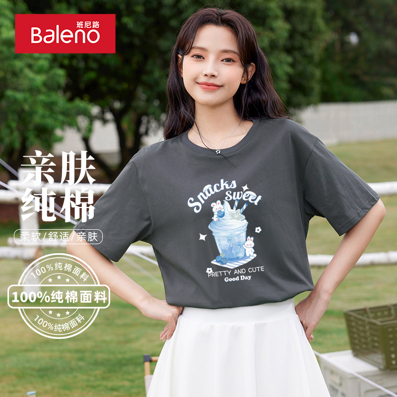班尼路蓝色纯棉短袖t恤女夏季宽松大码学生上衣2025新款半袖体恤H