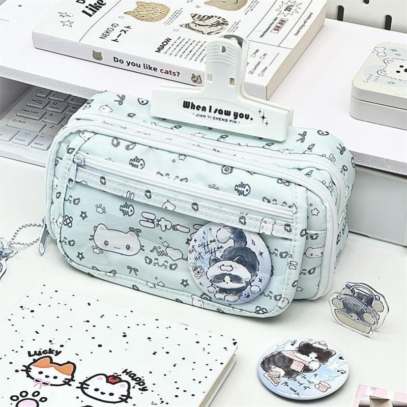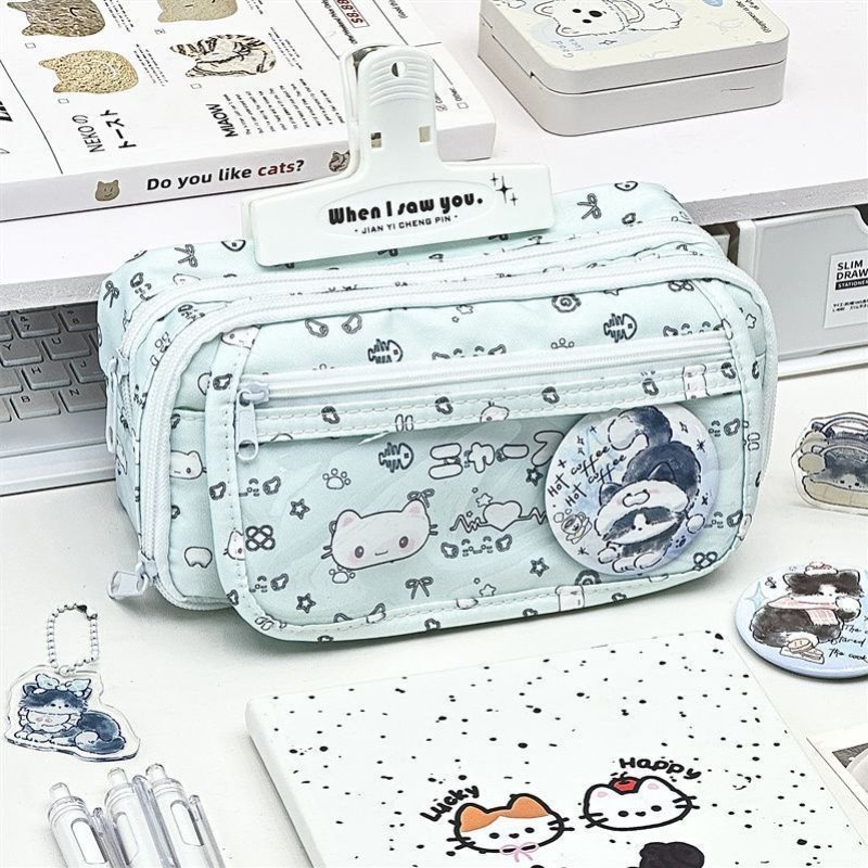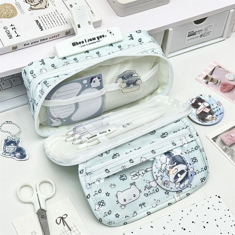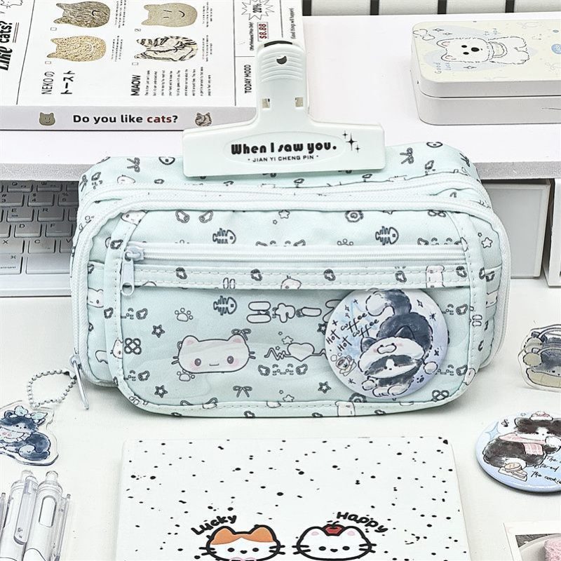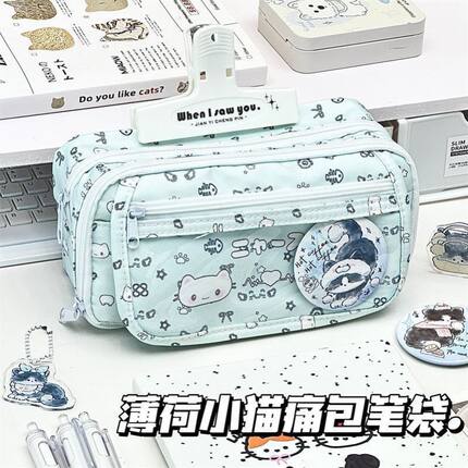 高颜值小众薄荷小猫多功能笔袋多层PVC大容量痛包学生文具收纳袋