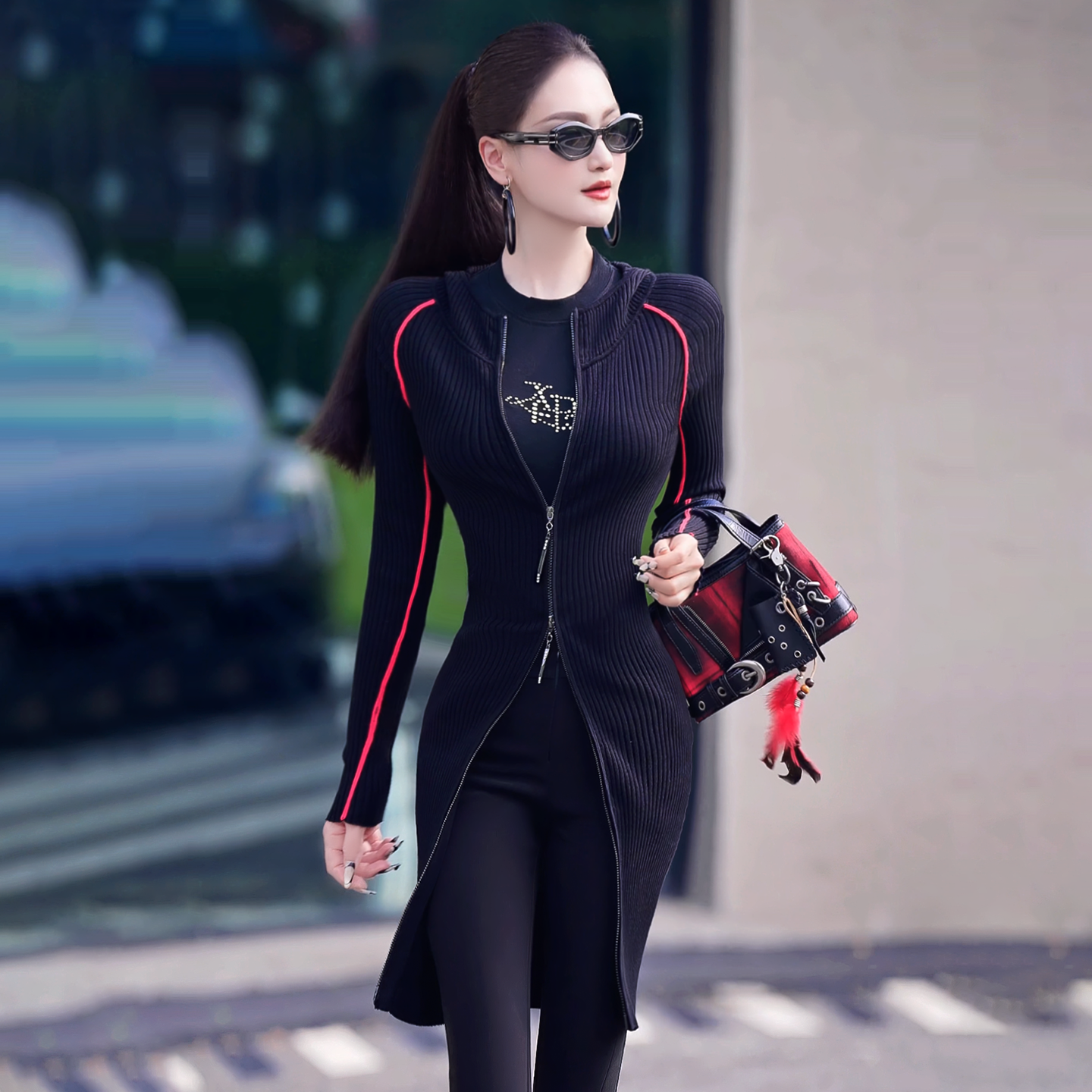 秋季休闲带帽针织裙2025新款修身气质减龄小众两穿拉链开衫连衣裙