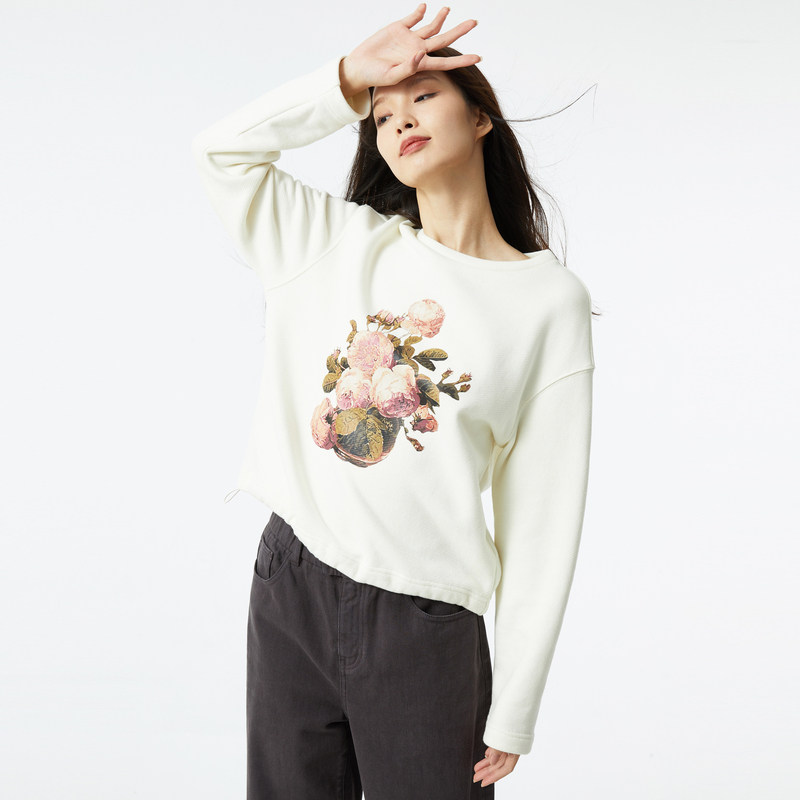 布景卫衣女冬季新品时尚花卉印花设计感圆领长袖宽松纯棉上衣1738