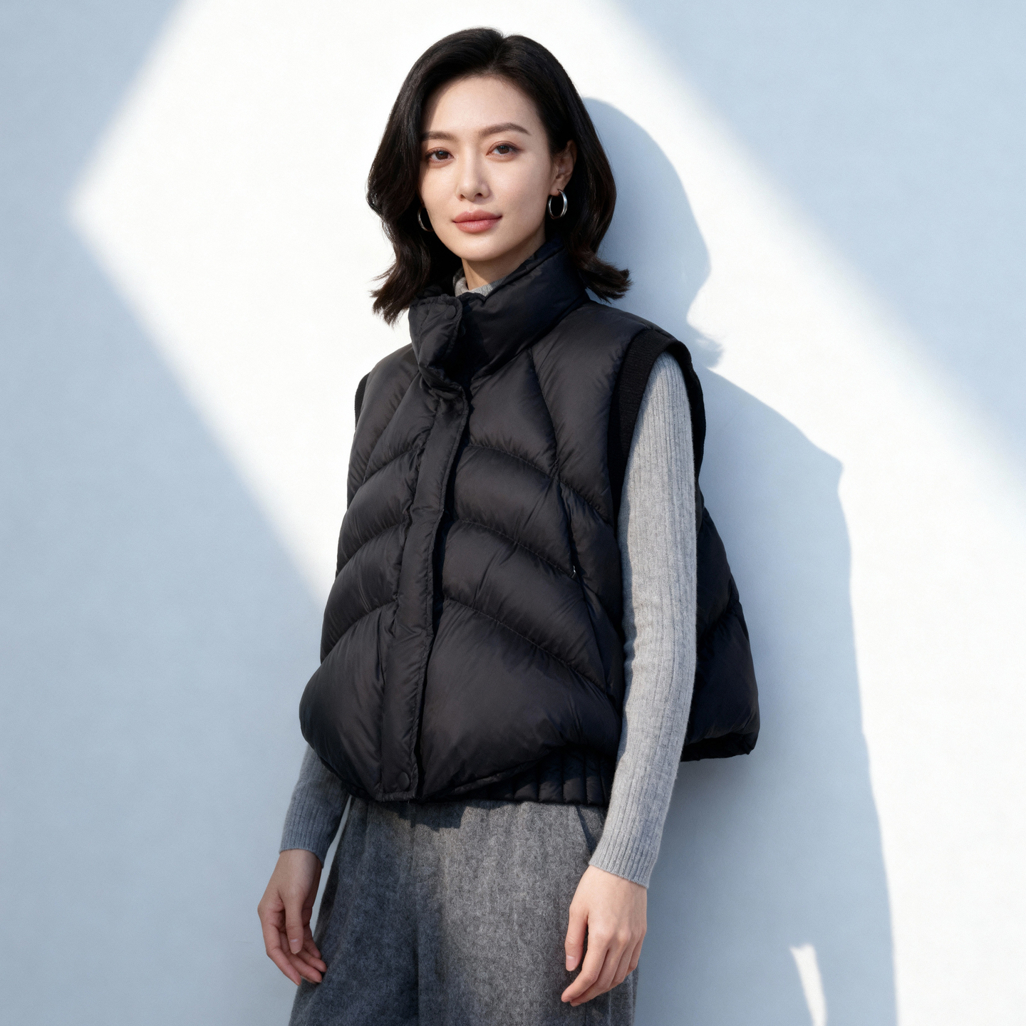 Basic House/百家好轻薄立领羽绒马甲女2025冬季保暖无袖短款外套
