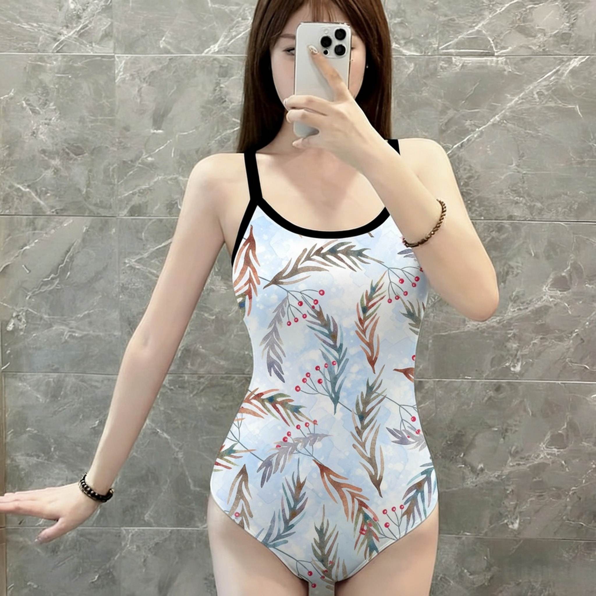 小清新印花吊带连体泳衣女新款专业竞速游泳衣高级感温泉度假泳装