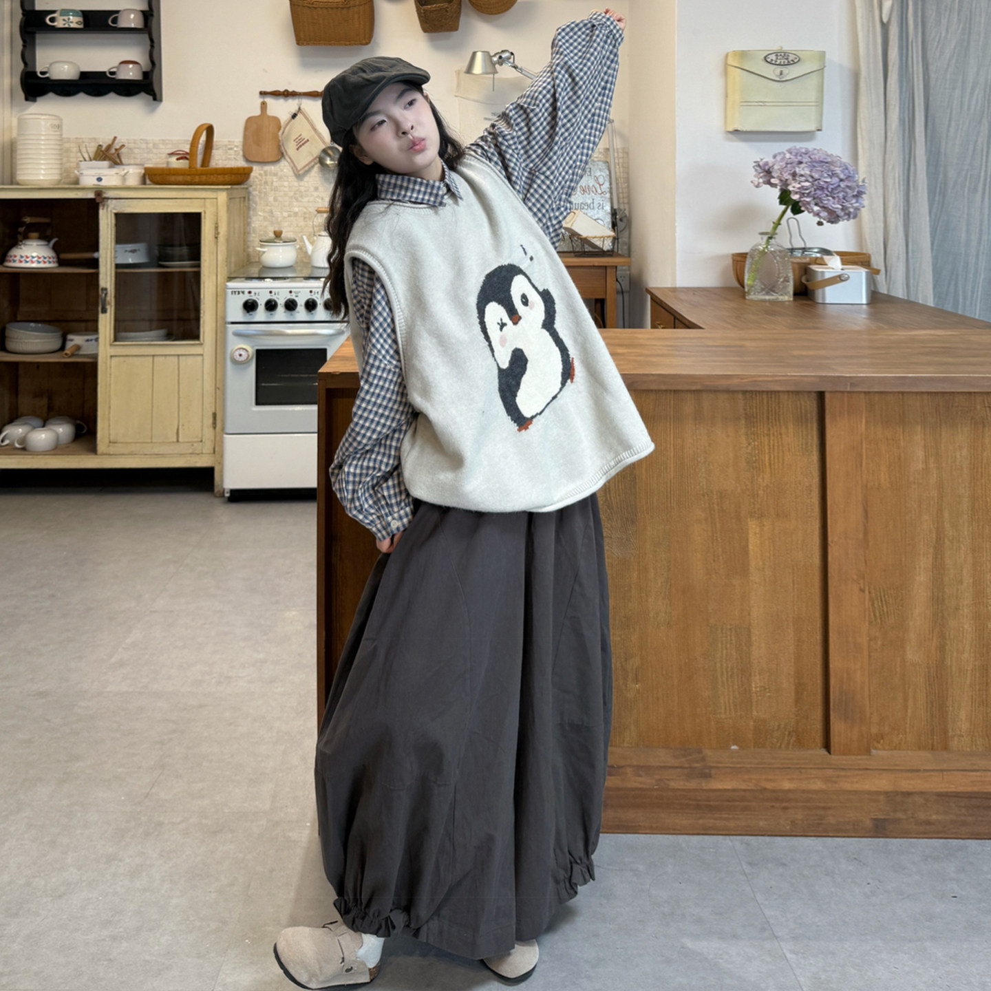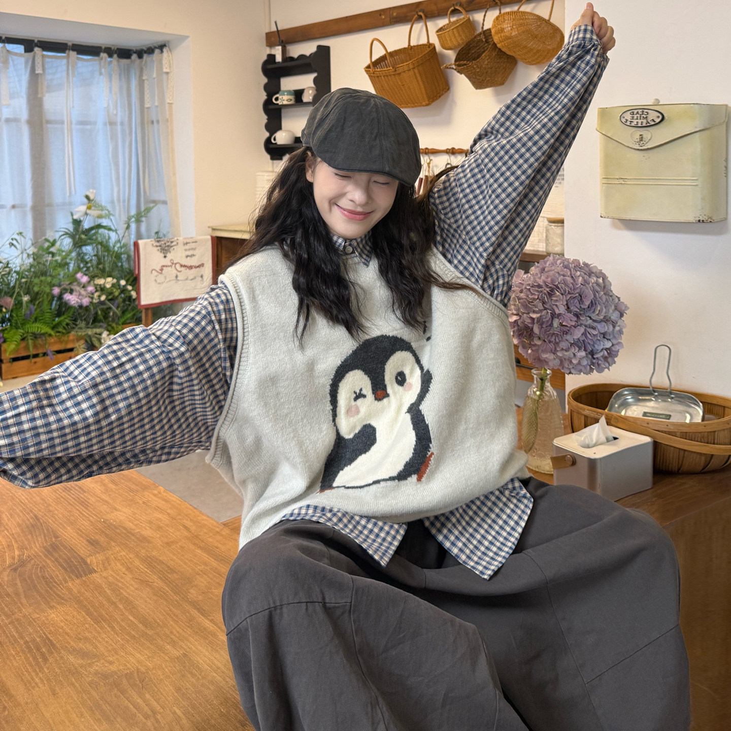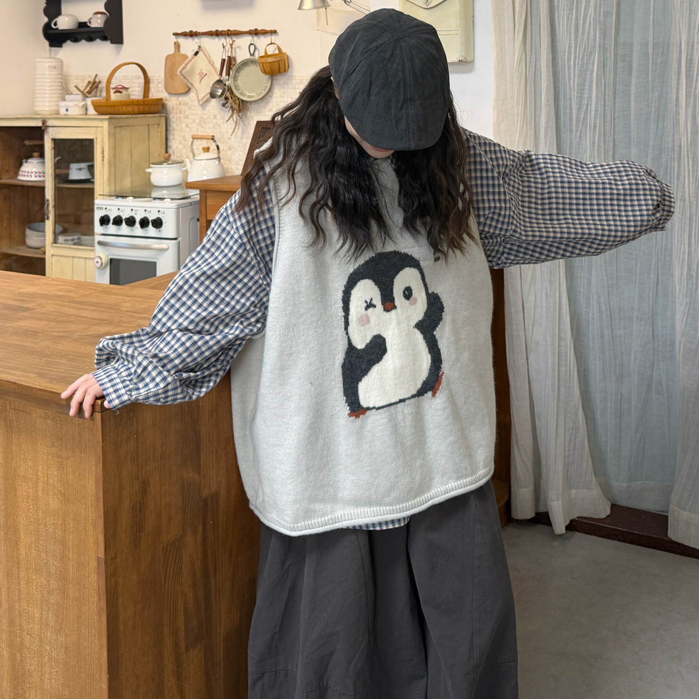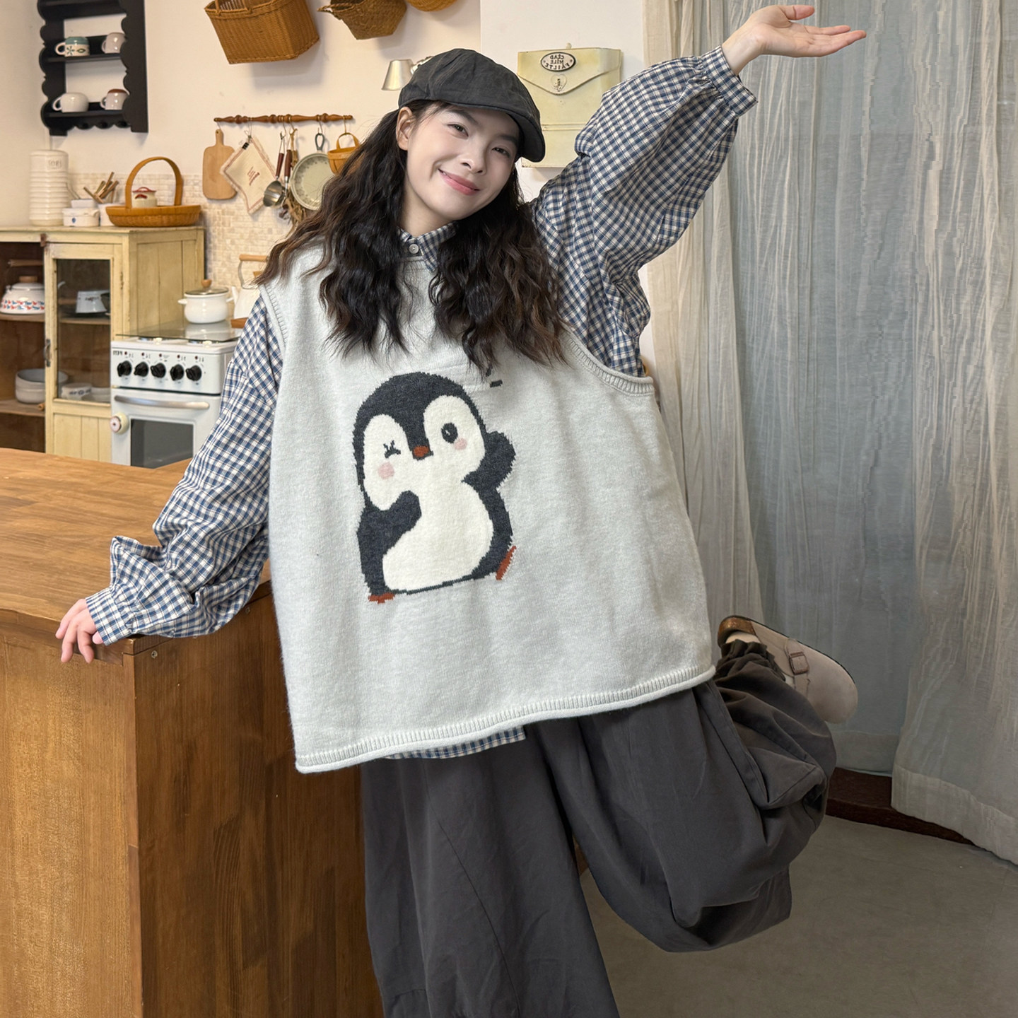 韩版格子衬衫+针织马甲+裤子套装