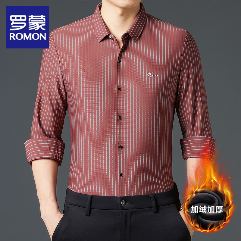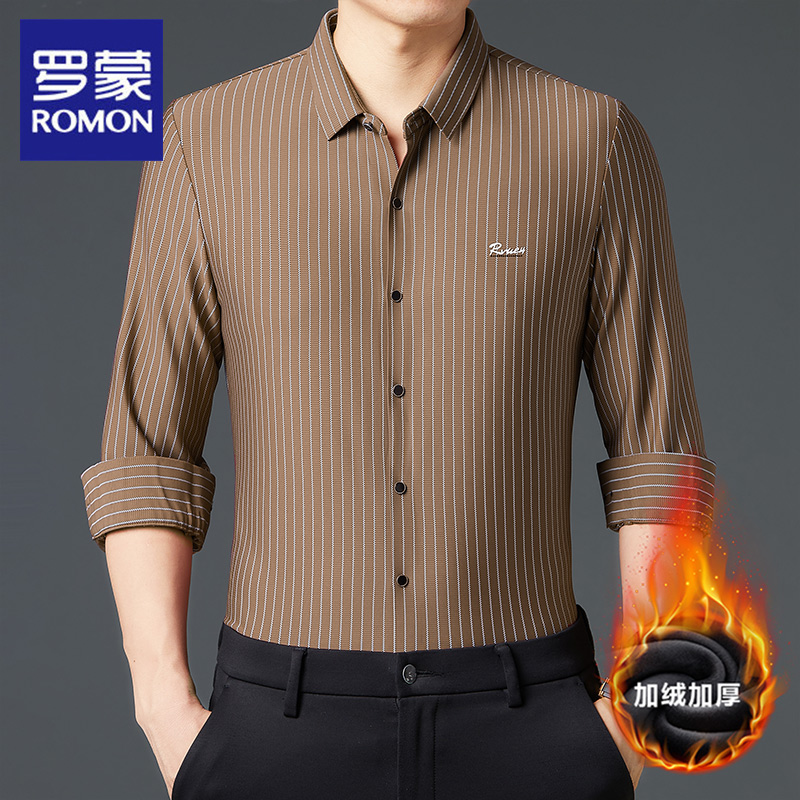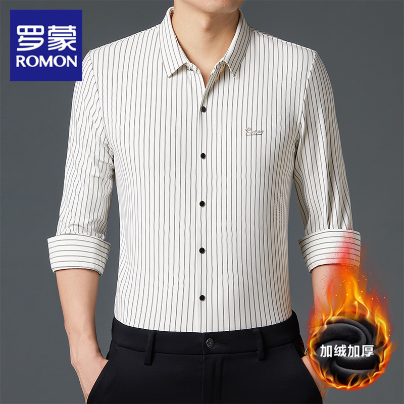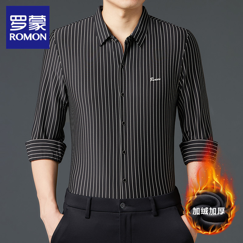 罗蒙无痕长袖衬衫男2025冬季新款加绒加厚保暖竖条纹衬衣休闲时尚