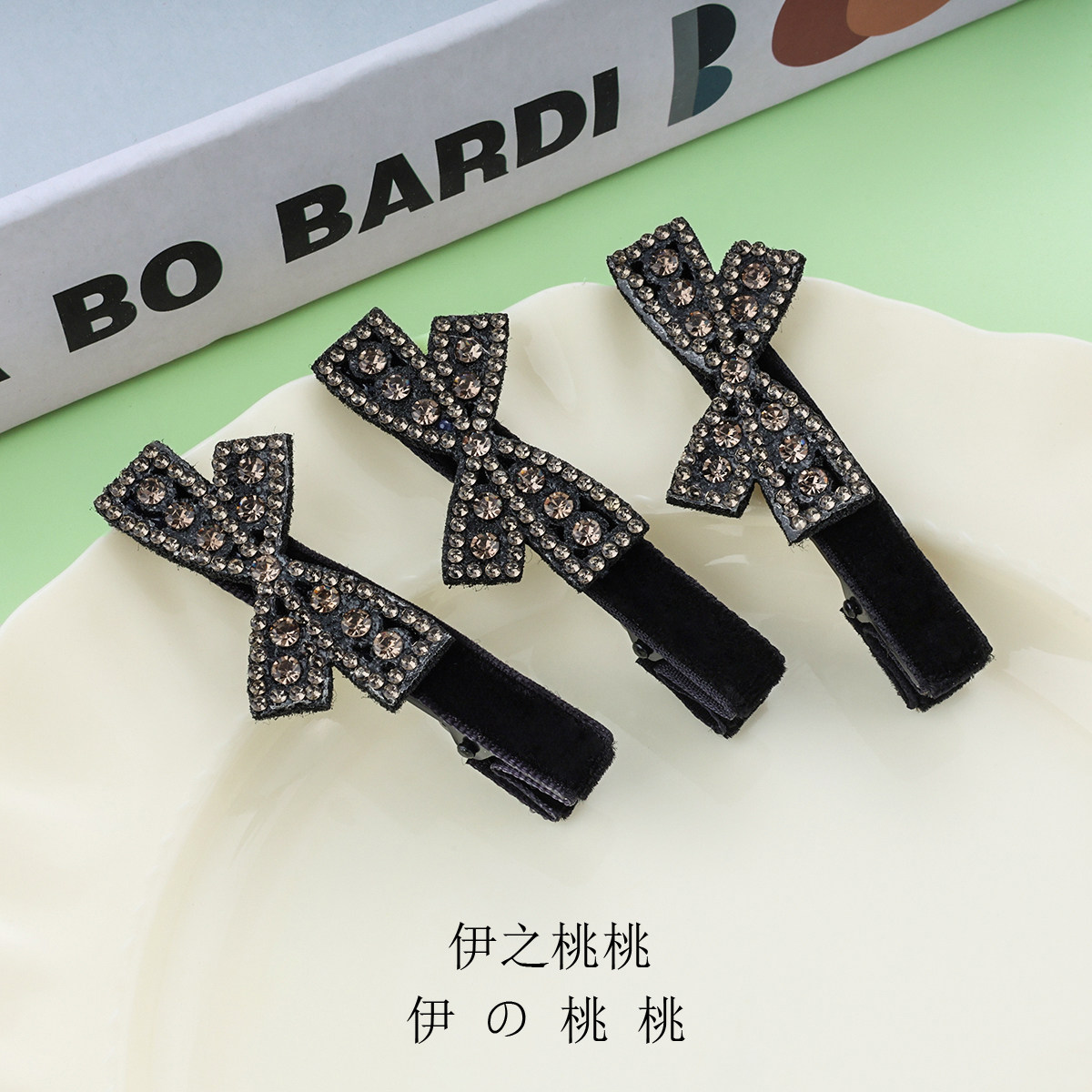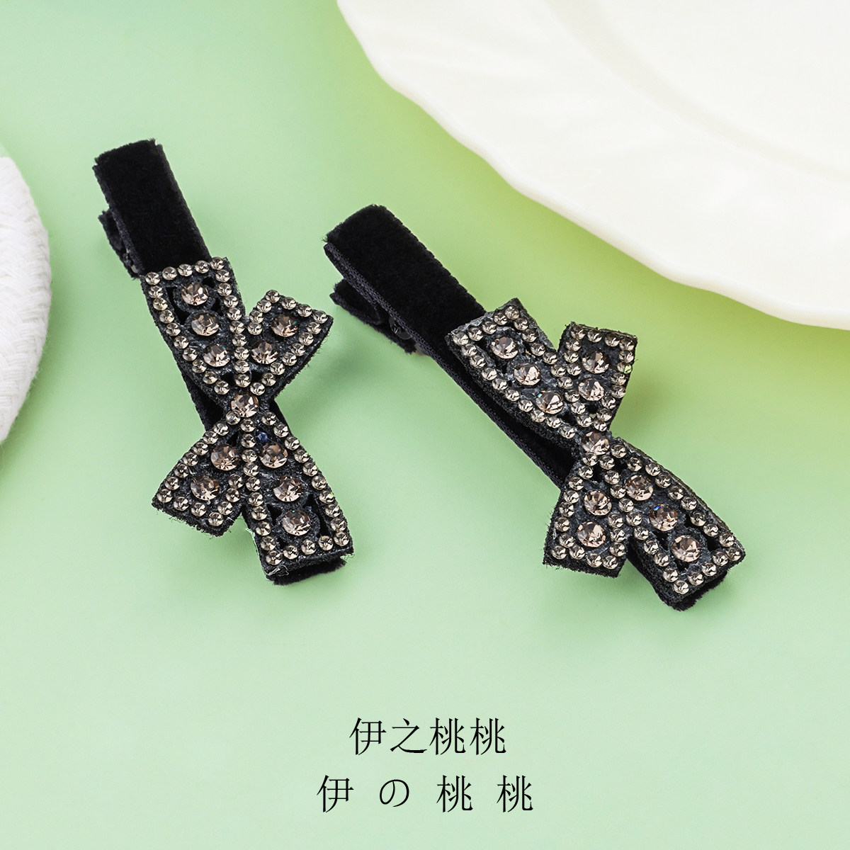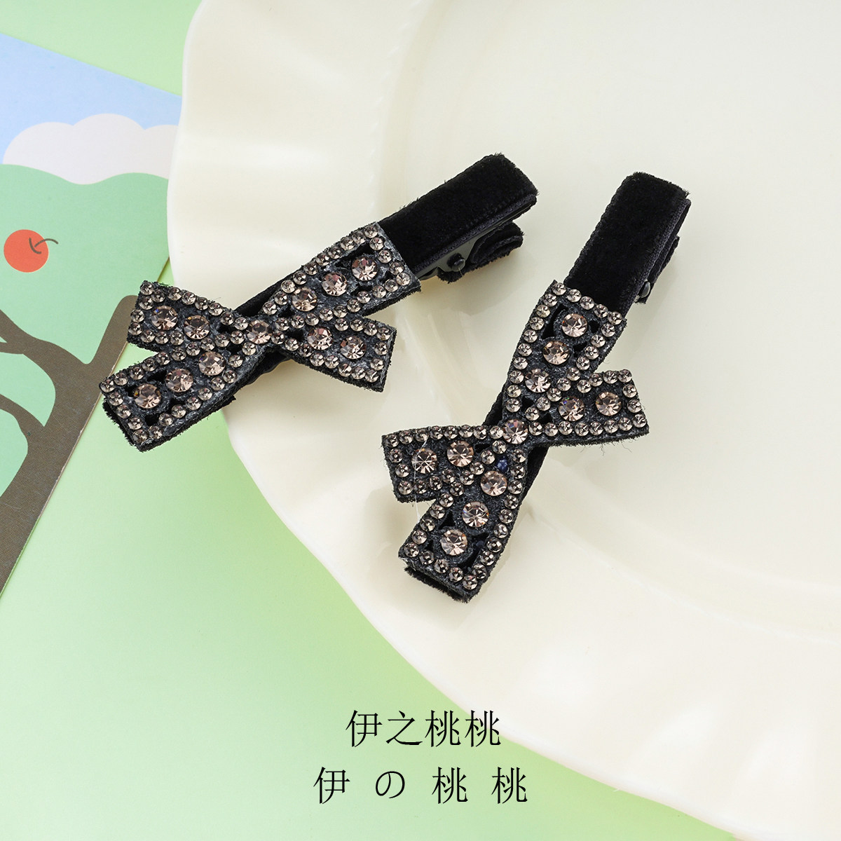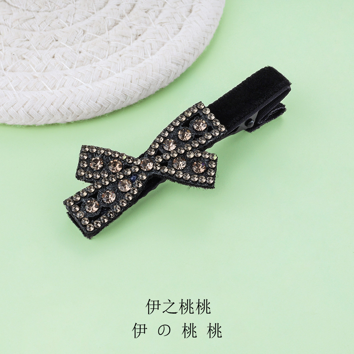 简约蝴蝶结水钻鸭嘴夹黑色丝绒刘海夹前额碎发夹侧边夹发卡发饰