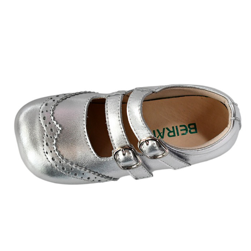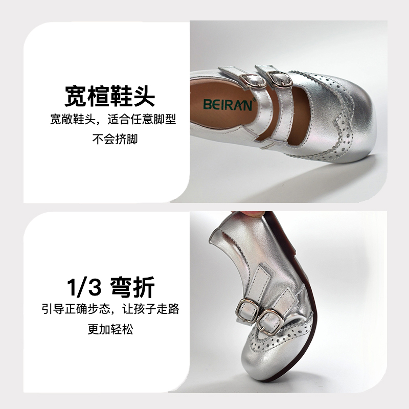 贝然真皮黑银色女童公主鞋2025新款春秋演出儿童皮鞋宝宝豆豆单鞋