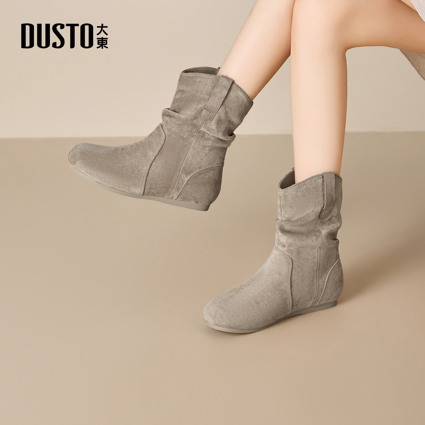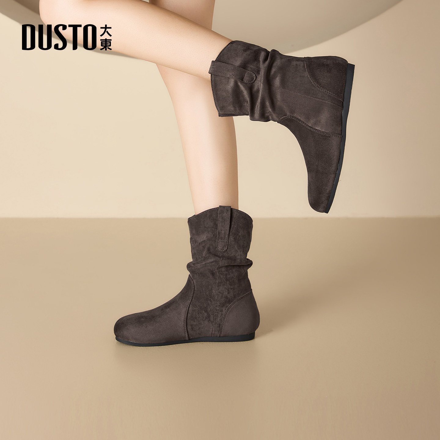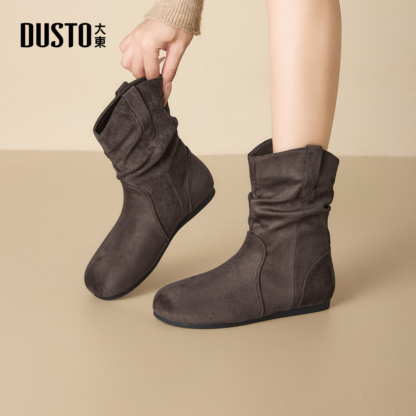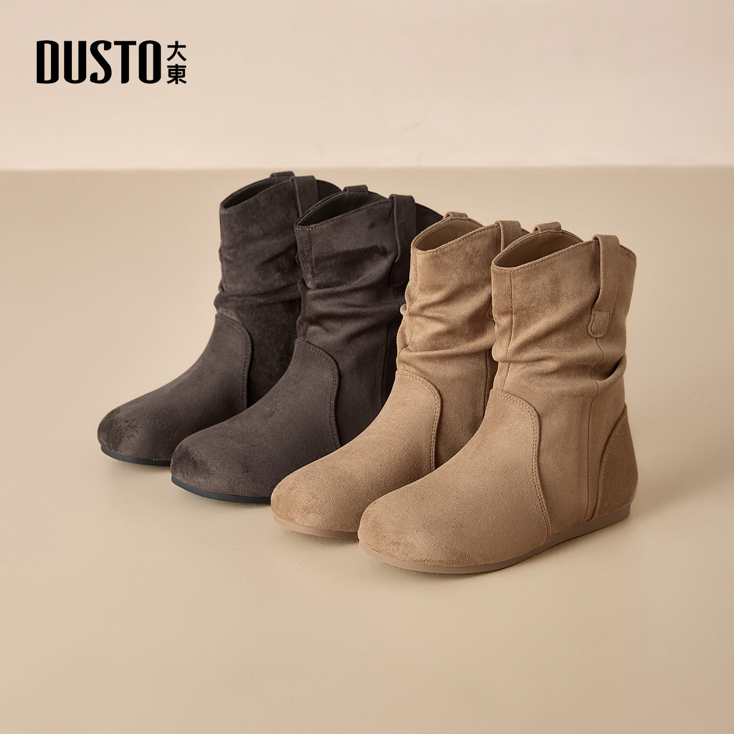 大东女靴时装靴2025冬季新款复古绒面西部加绒靴子中筒靴堆堆靴
