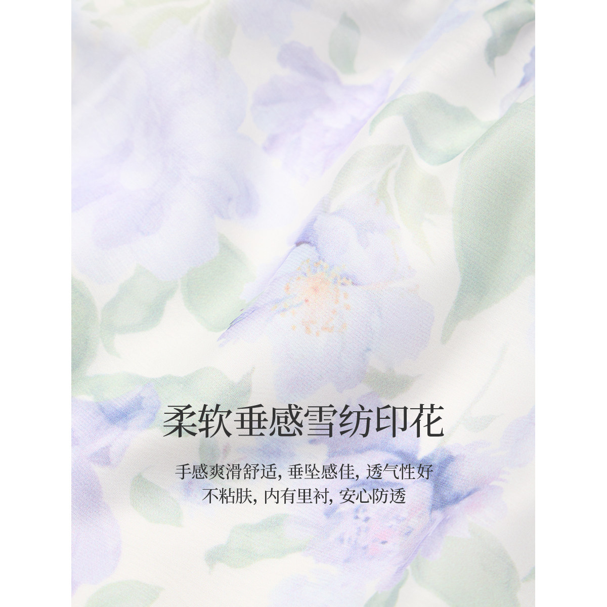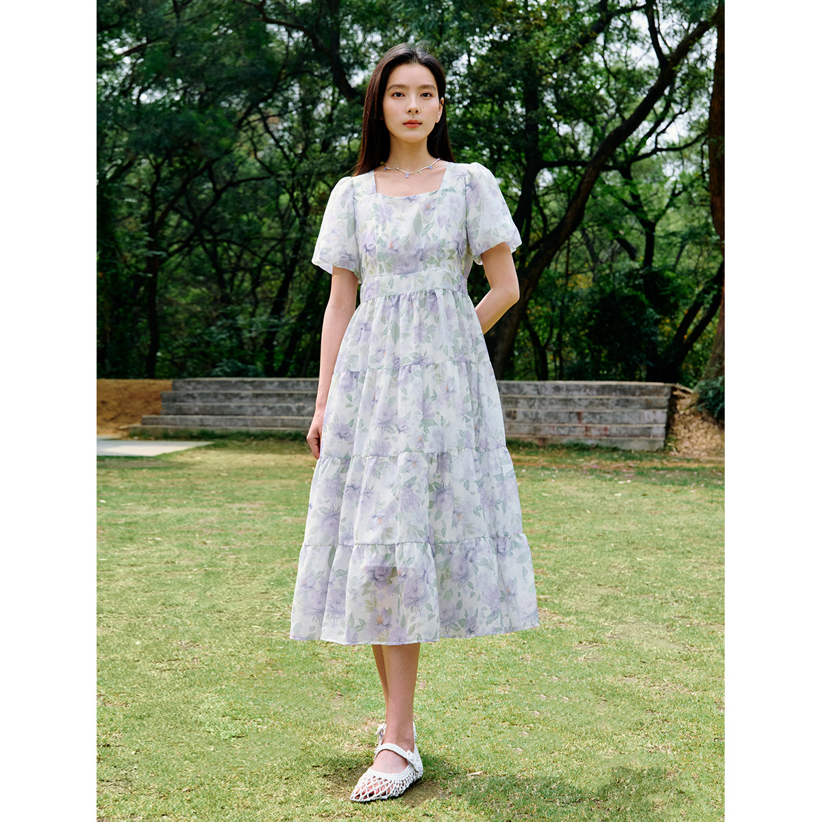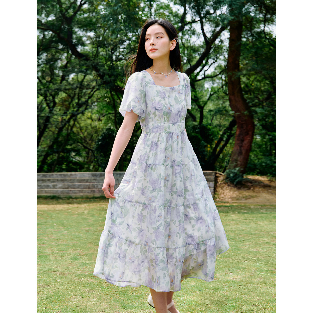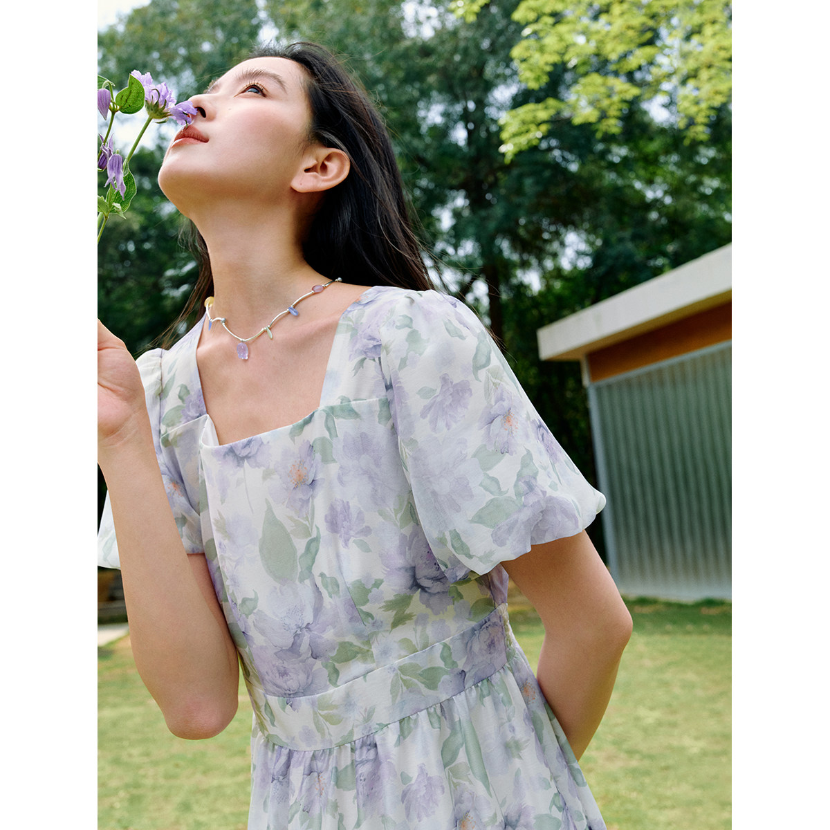 茵曼淡人穿搭碎花连衣裙2025夏季女装新款褶皱方领泡泡袖仙女裙