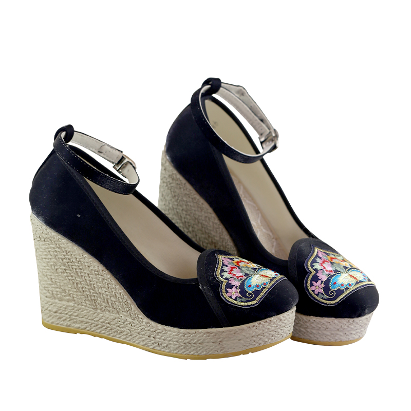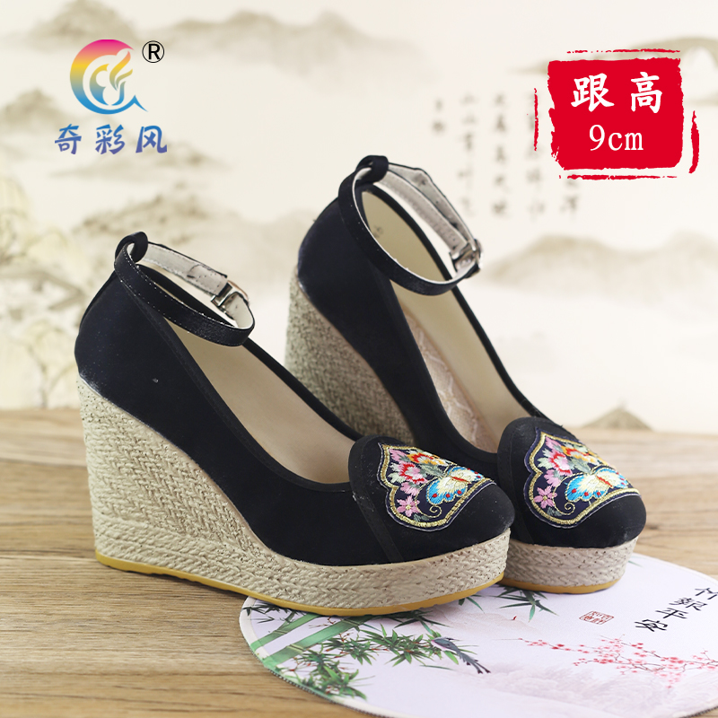 坡跟女鞋高跟绣花鞋布厚底民族风