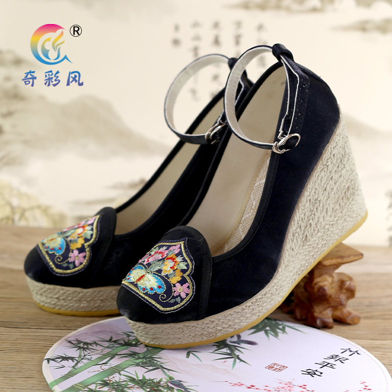 坡跟女鞋高跟绣花鞋布汉服古代鞋民族风女鞋厚底高跟绣花鞋布鞋女