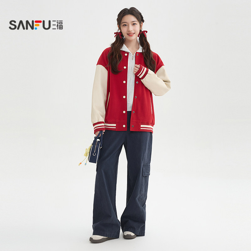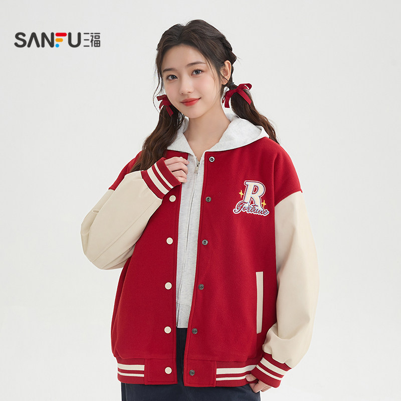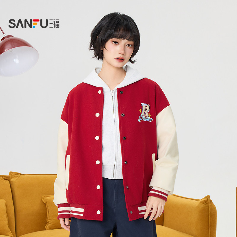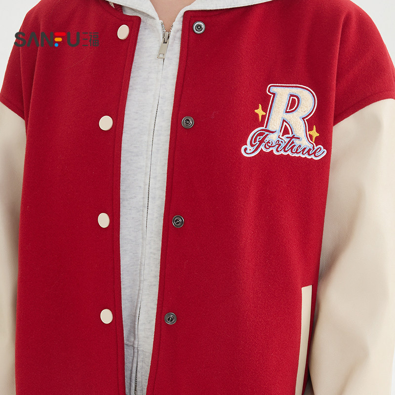 三福学院风加厚外套2026春季字母毛巾绣拼PU皮袖棒球服女装516188