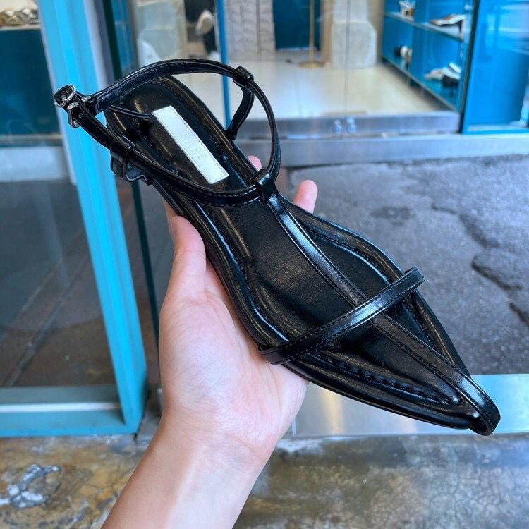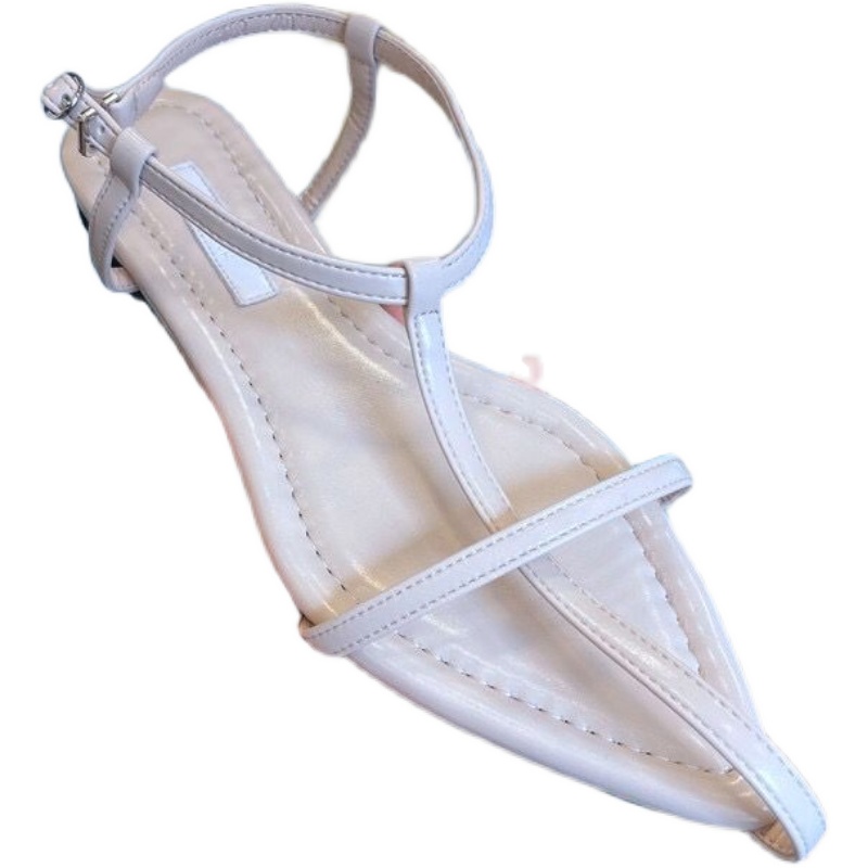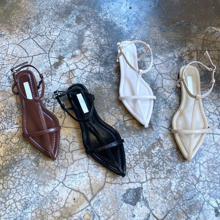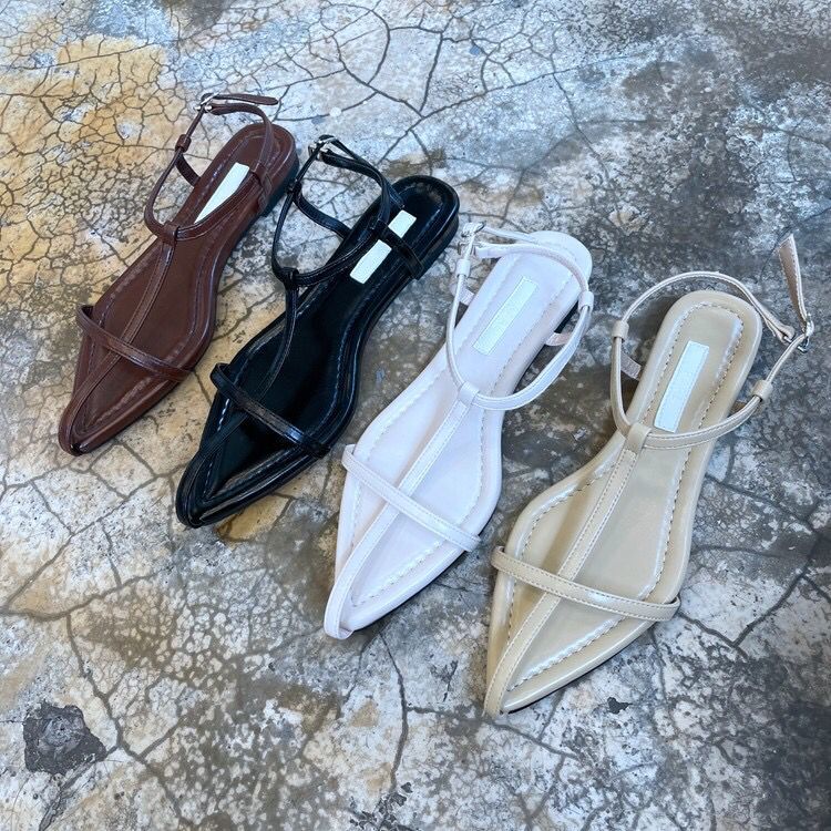 韩国 欧洲站东大门实拍22夏新款ins极简风十字细带尖头平底凉鞋