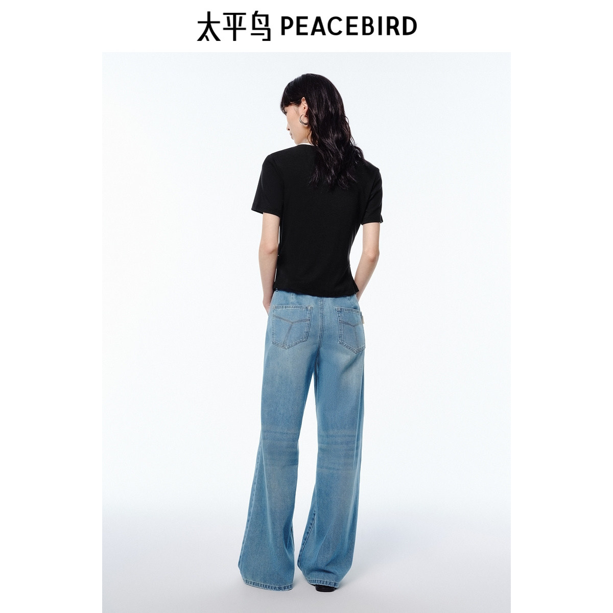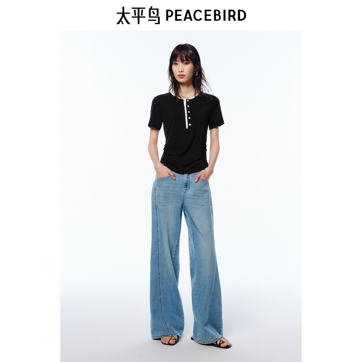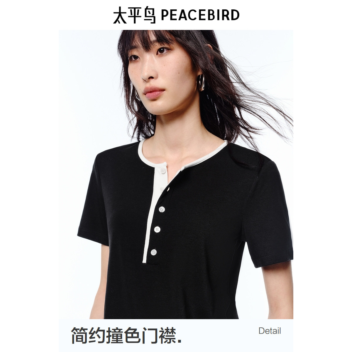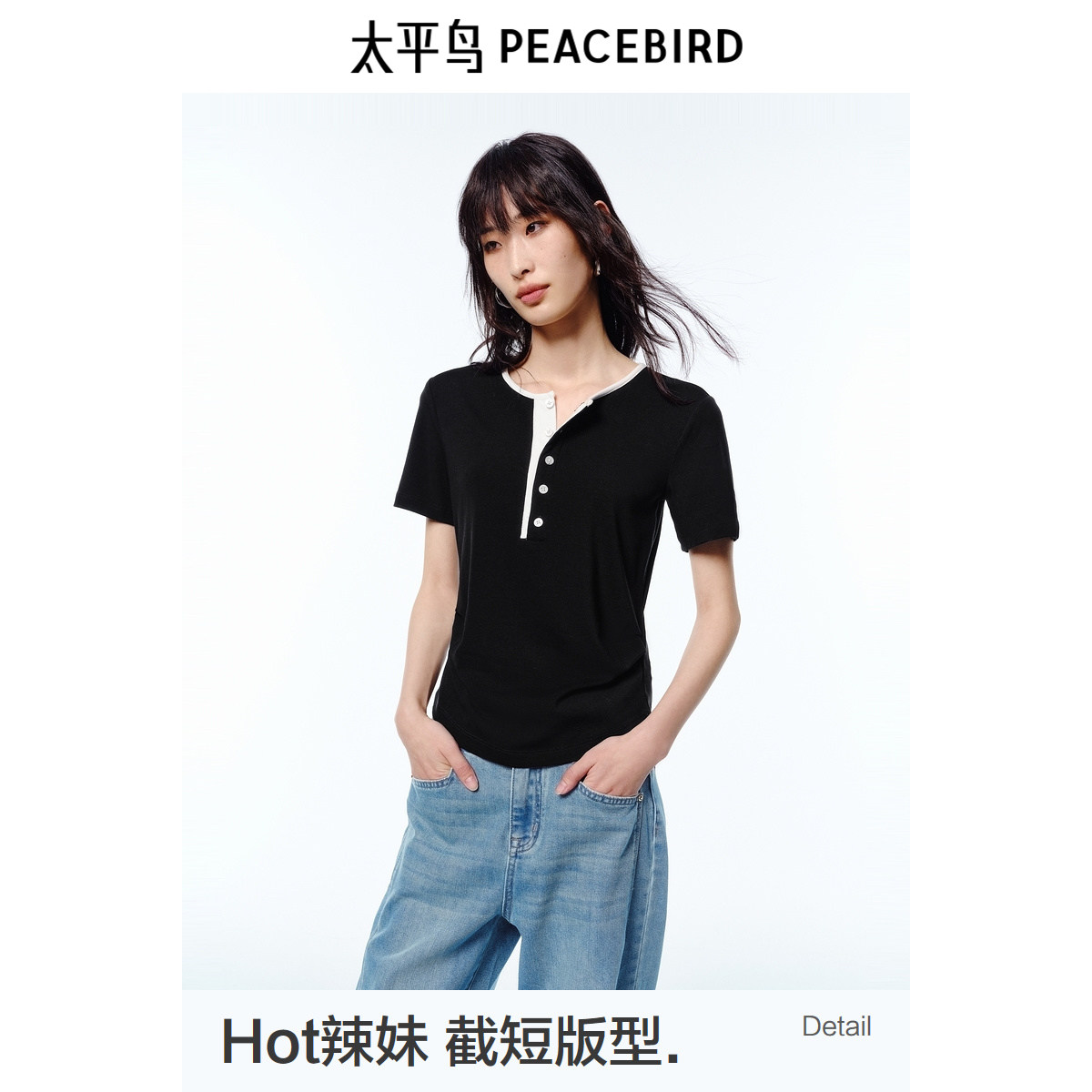 【断码秒杀】太平鸟时尚撞色打底短袖T恤女门襟纽扣修身显瘦上衣