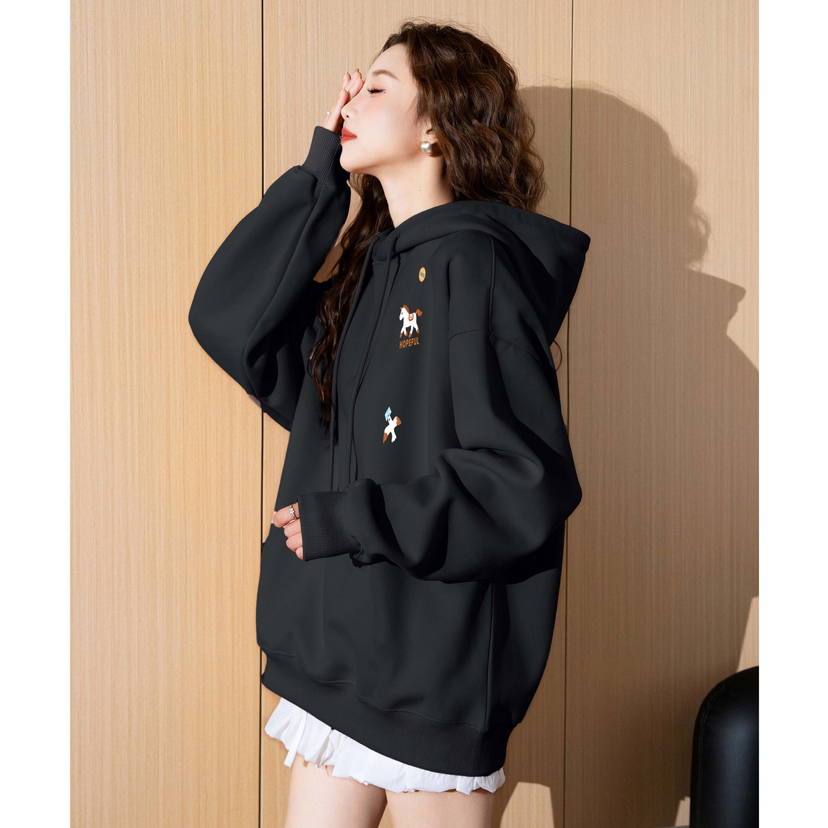唐狮2026秋冬季女士加绒连帽卫衣卡通印花通勤套头宽松型慵懒休闲