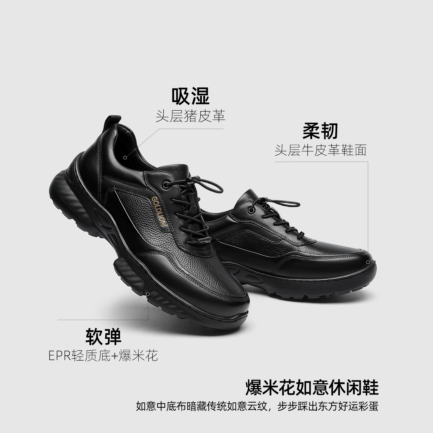 Goldlion男鞋官方正品2025年秋季新款爆米花运动休闲男士轻弹皮鞋