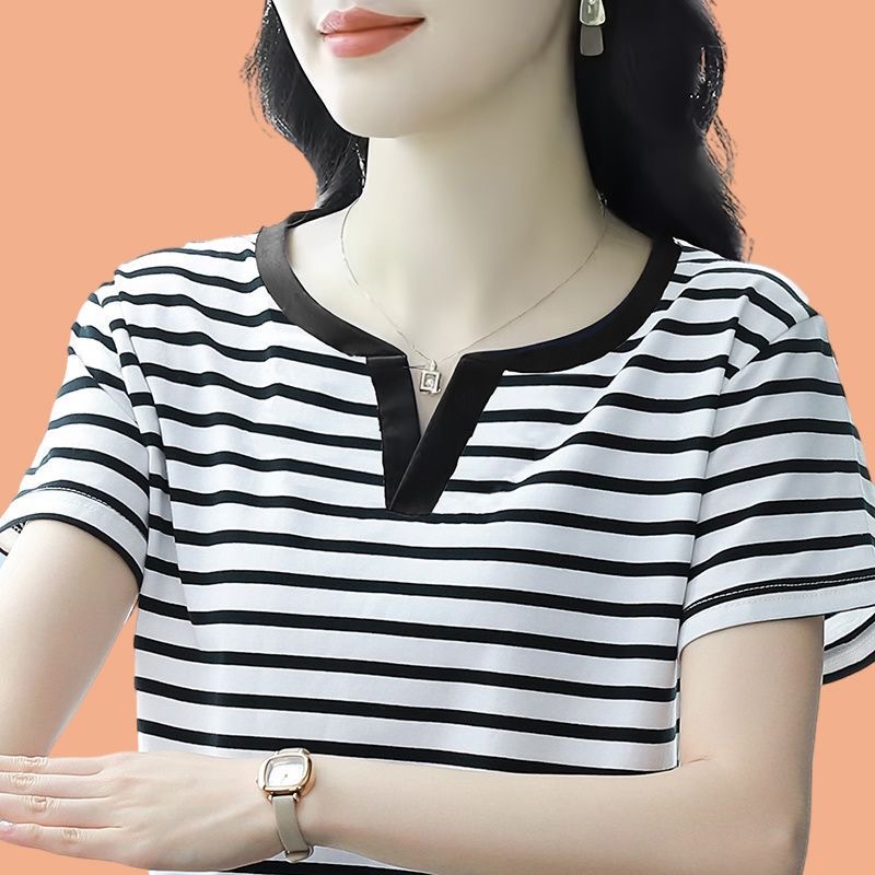 2025新款纯棉短袖t恤女妈妈夏装大码宽松显瘦半袖体恤v领条纹上衣