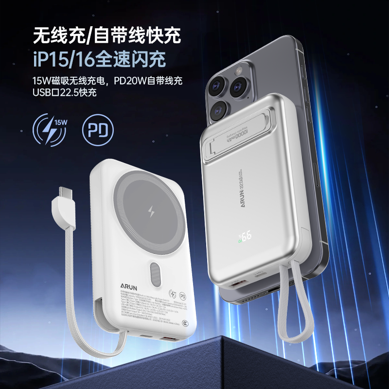 【国家3C认证】ARUN海陆通磁吸无线充电宝快充薄移动电源适用苹果
