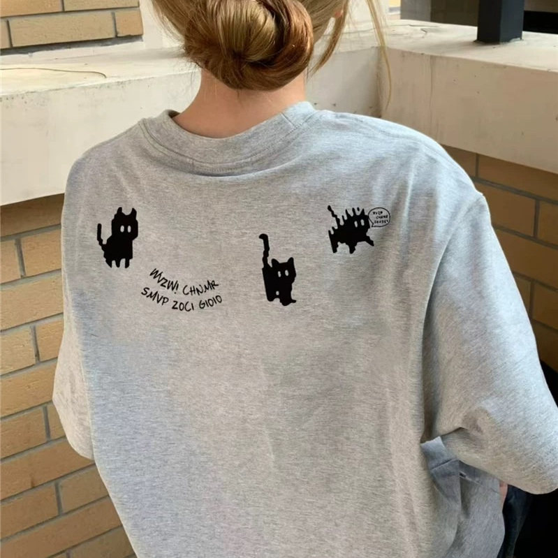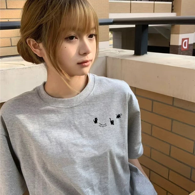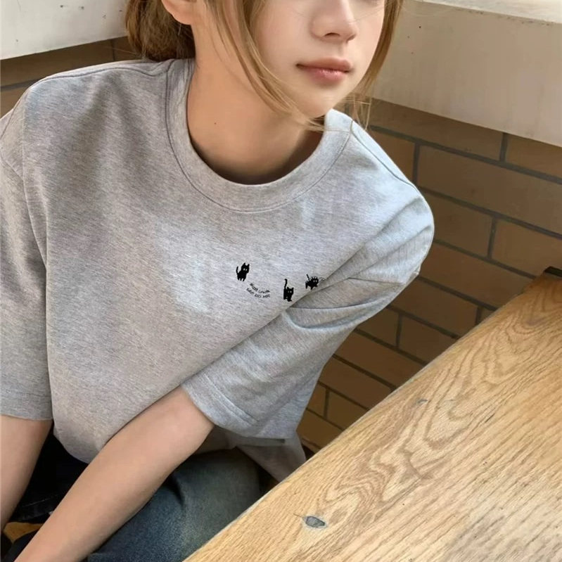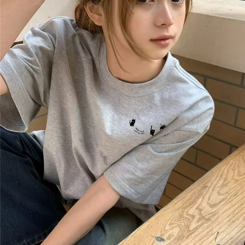 纯棉灰色小众设计感短袖t恤女宽松小个子女大童美式潮牌正肩上衣