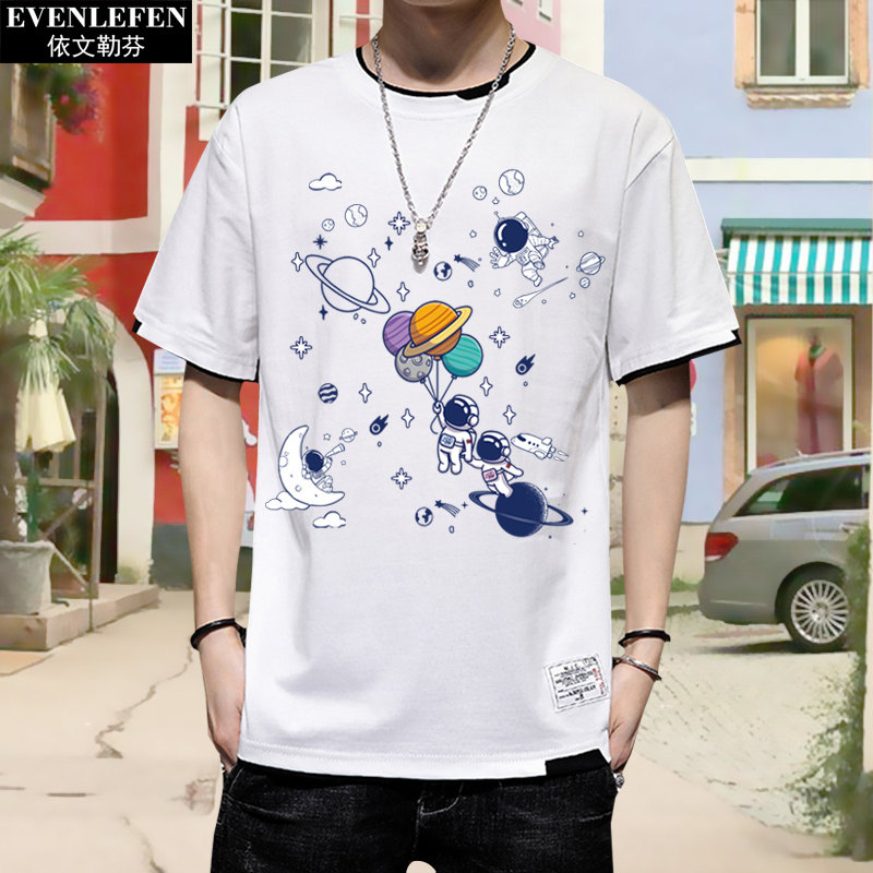 太空宇航员个性创意NASA探索土星拼接短袖T恤衫男女纯棉半袖衣服