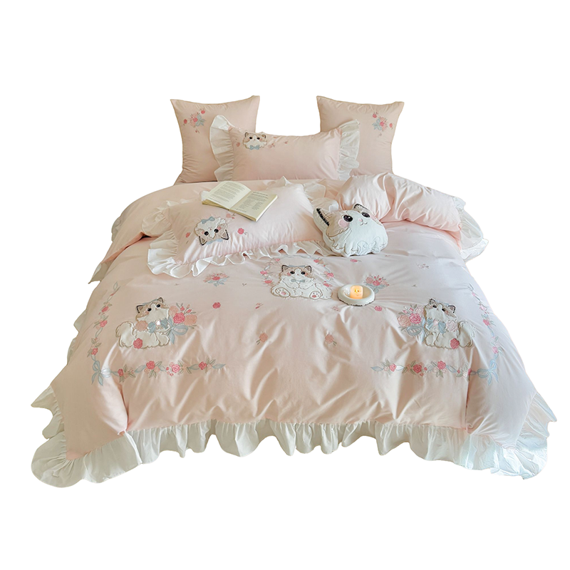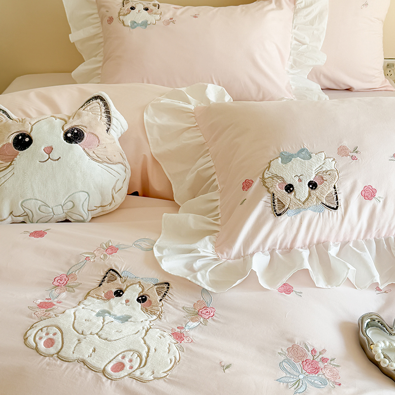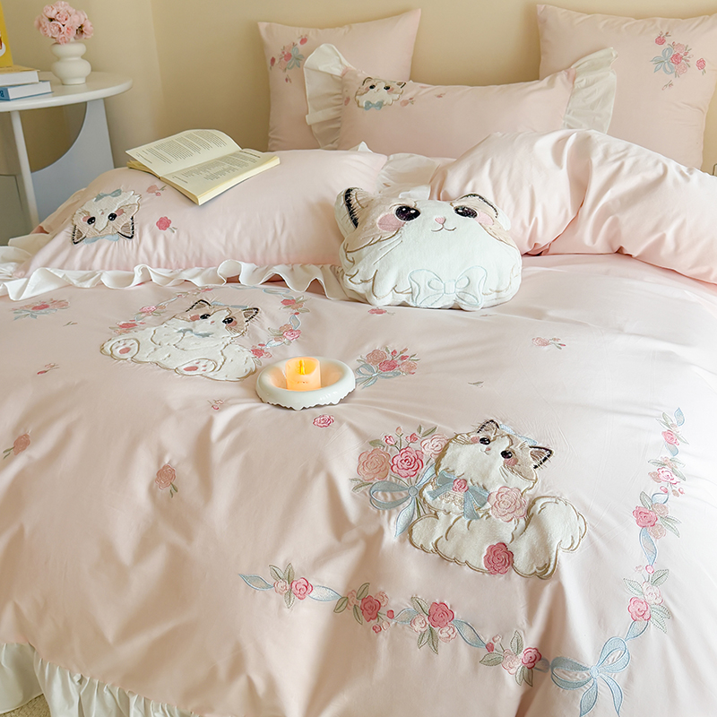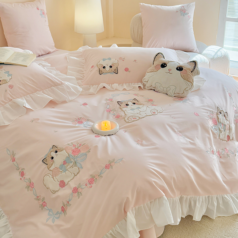 可爱少女卡通全棉水洗棉床上四件套猫咪刺绣被套床单儿童纯棉床品