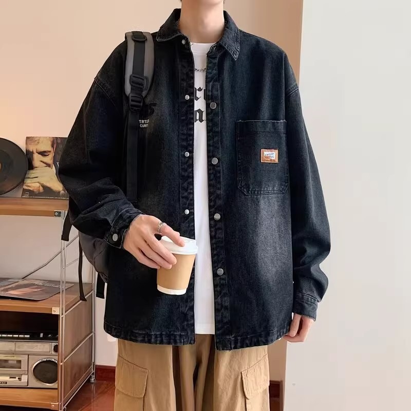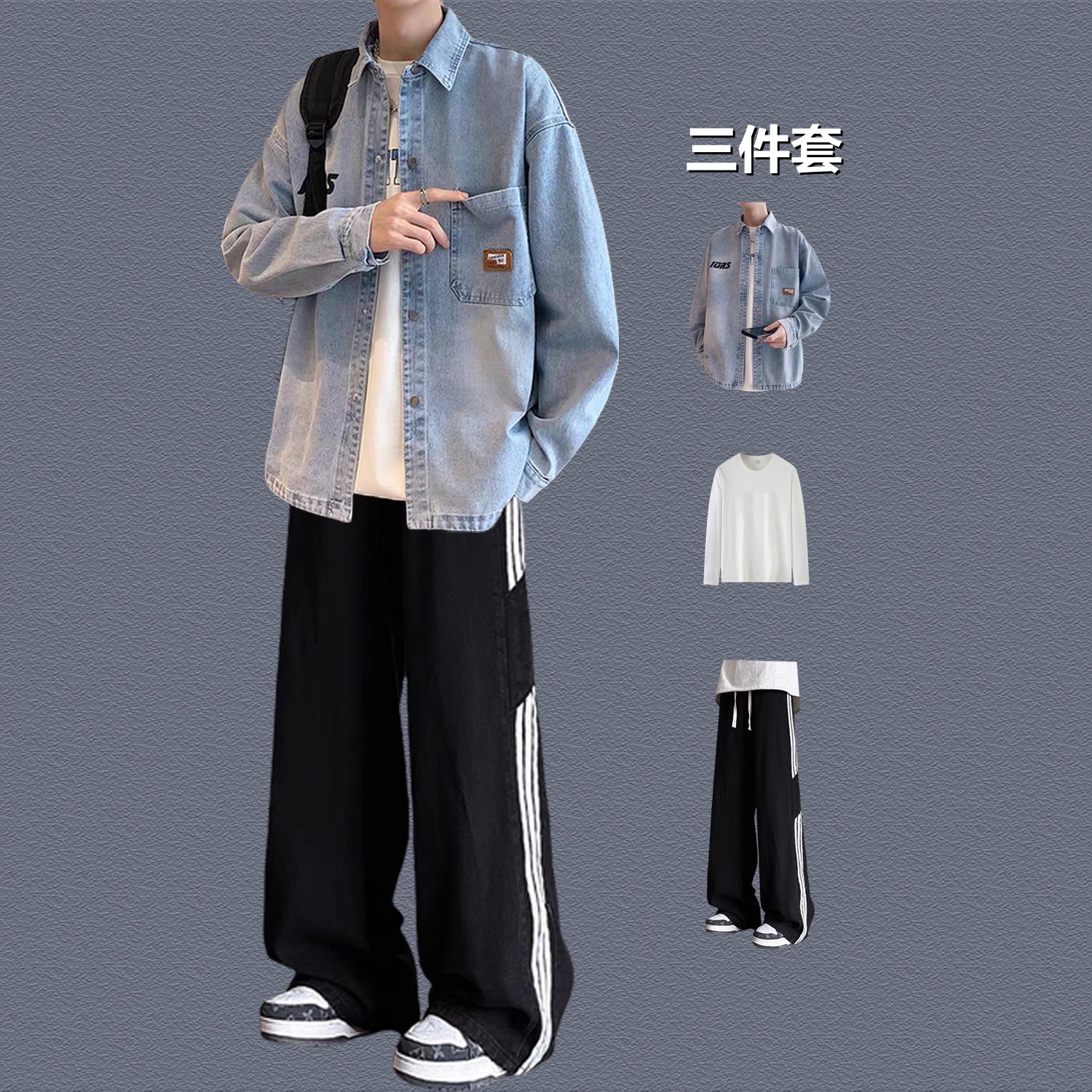 休闲风牛仔衬衫外套男士三件套春秋季套装潮流高级感夹克一套搭配