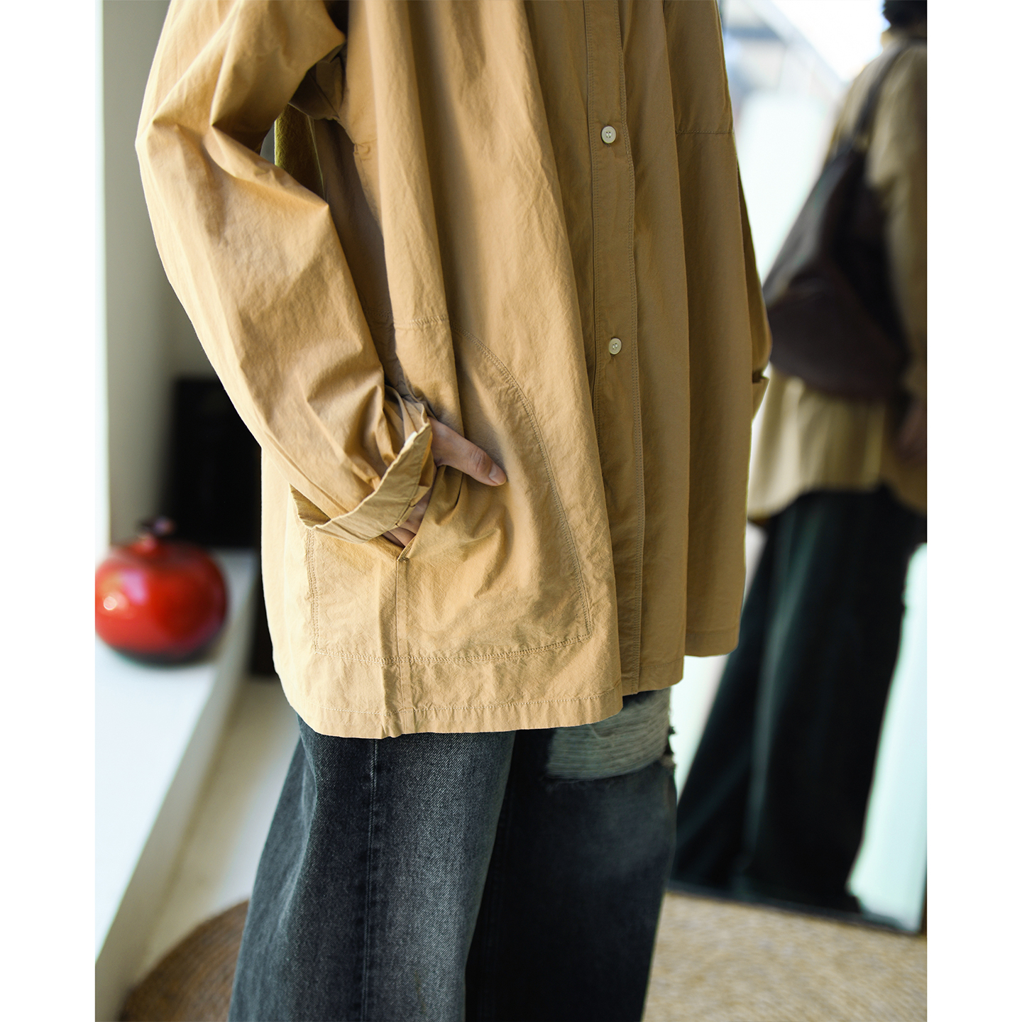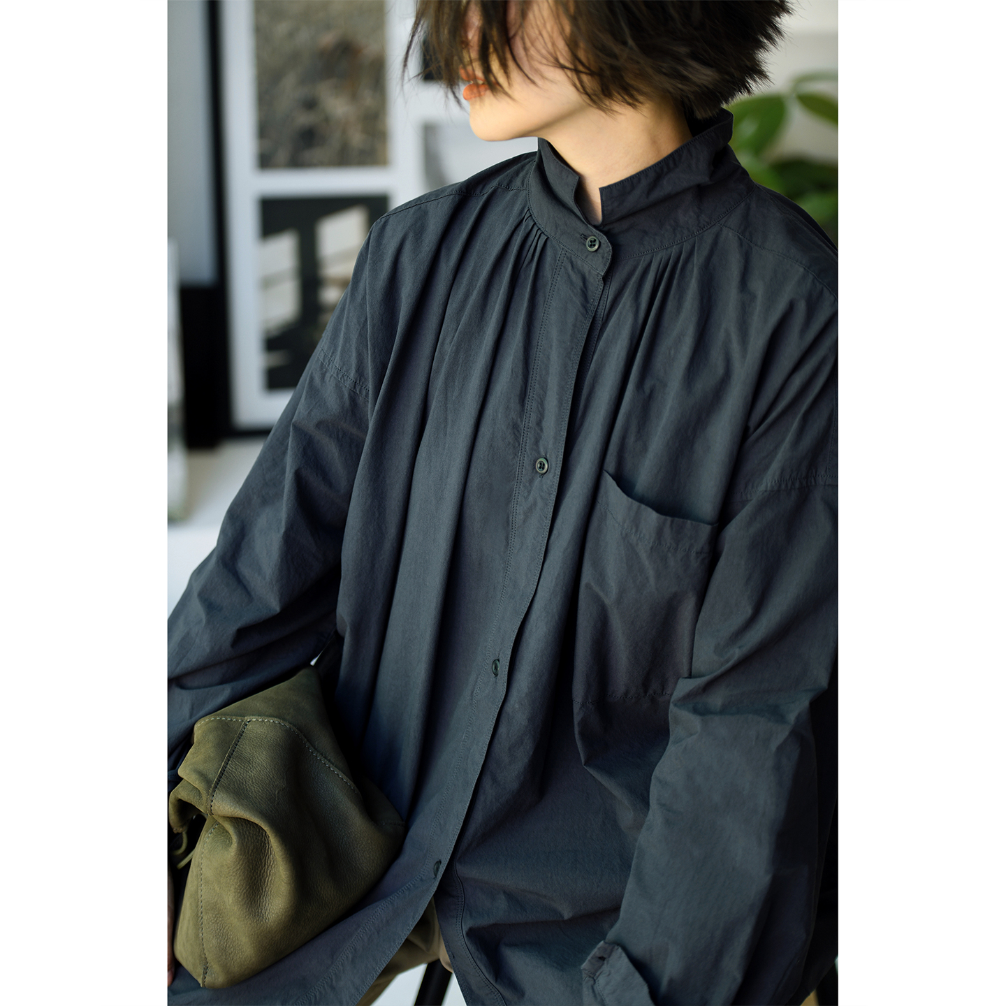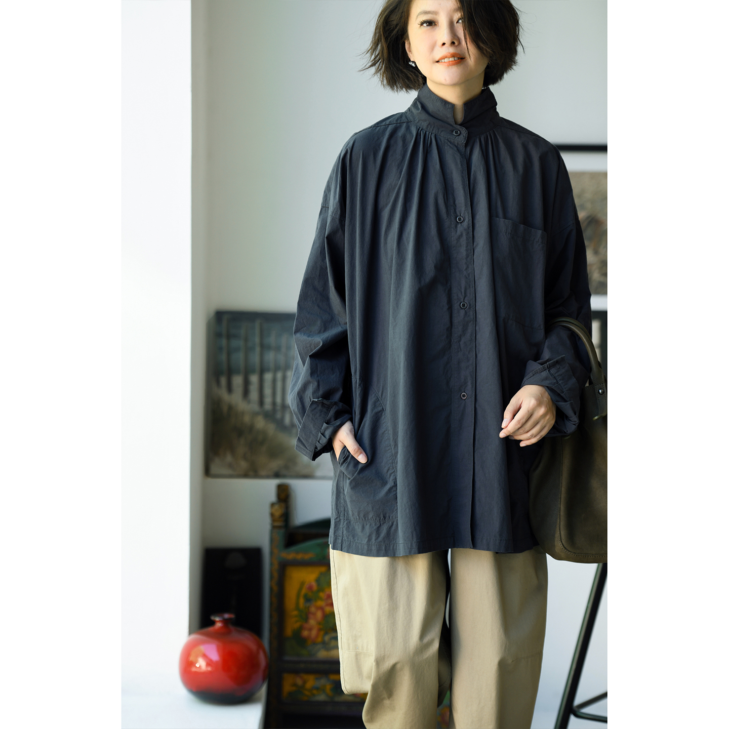 包邮C99006 日式文艺休闲翻领捏褶落肩宽松纯棉双兜长款衬衫女秋