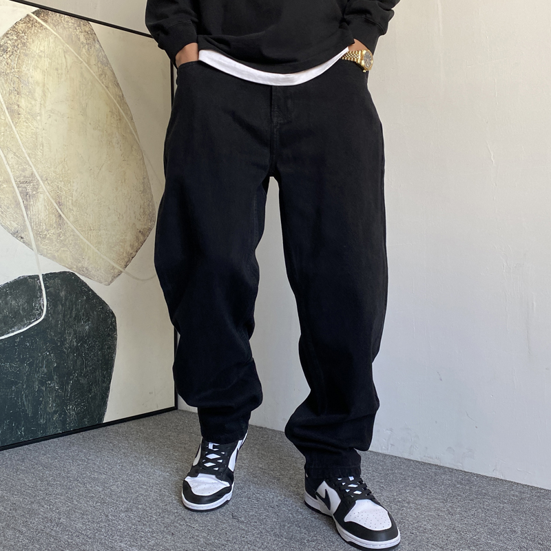 春秋季美式休闲痞帅水洗复古黑色牛仔裤男直筒宽松百搭阔腿裤子潮