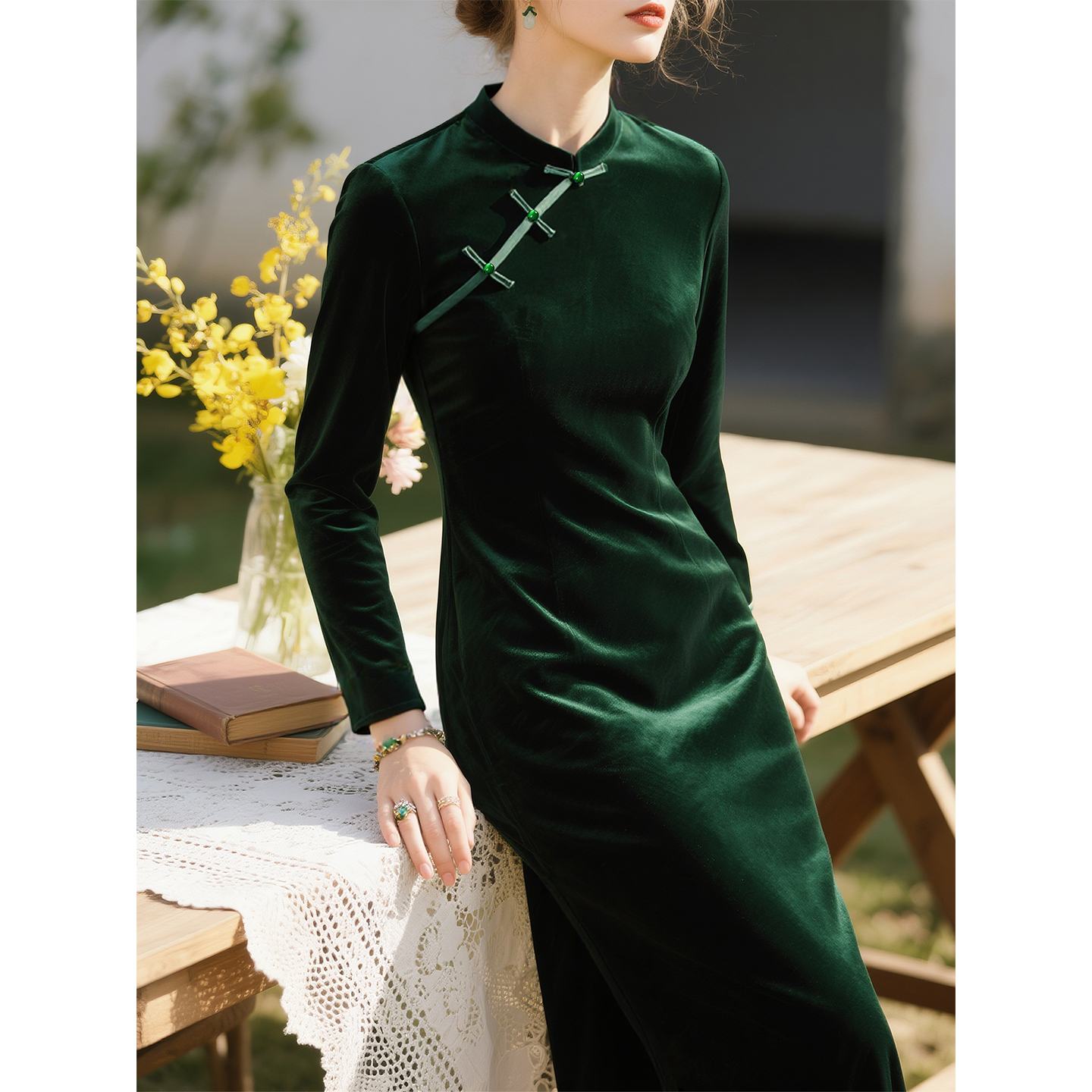 新中式丝绒旗袍连衣裙女2025年秋冬新款国风复古盘扣收腰显瘦长裙