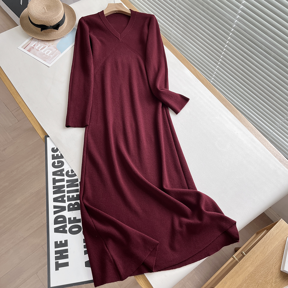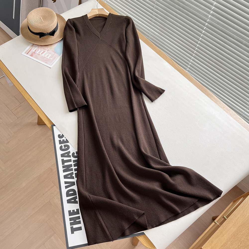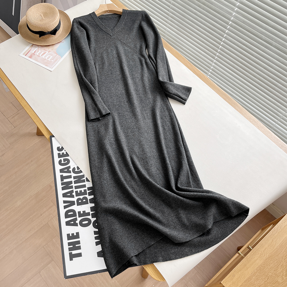 法式v领大衣内搭打底毛衣女秋冬款纯色通勤百搭针织连衣裙长裙