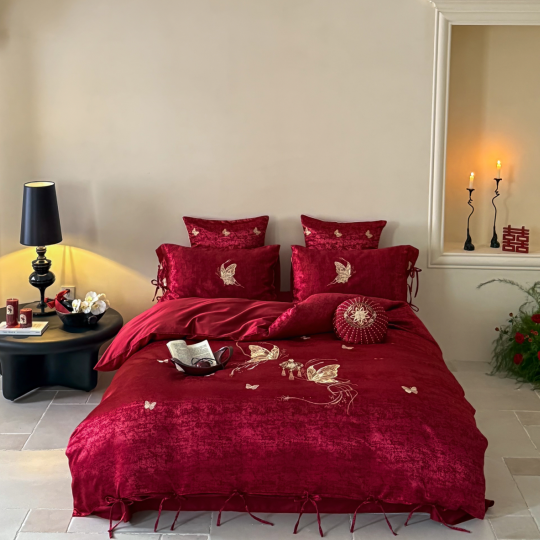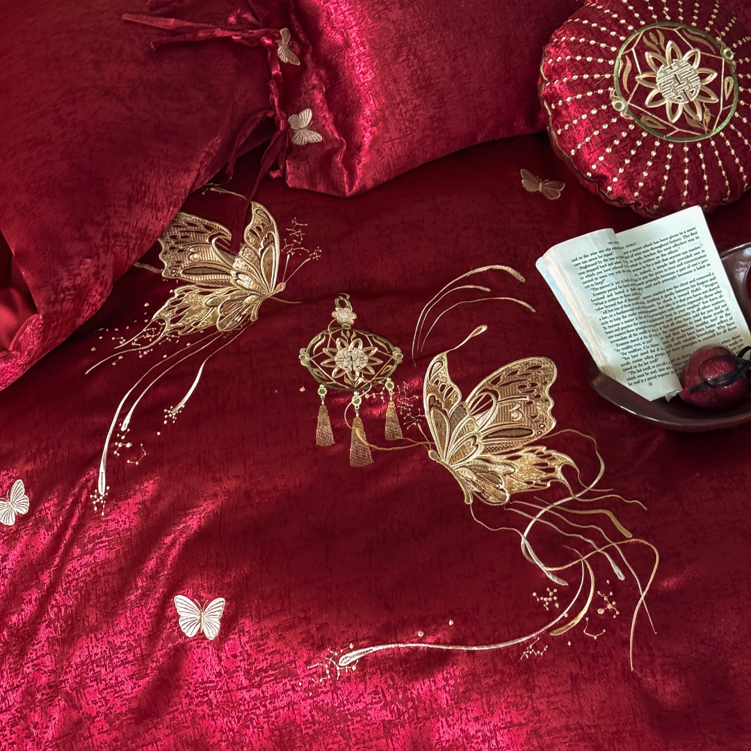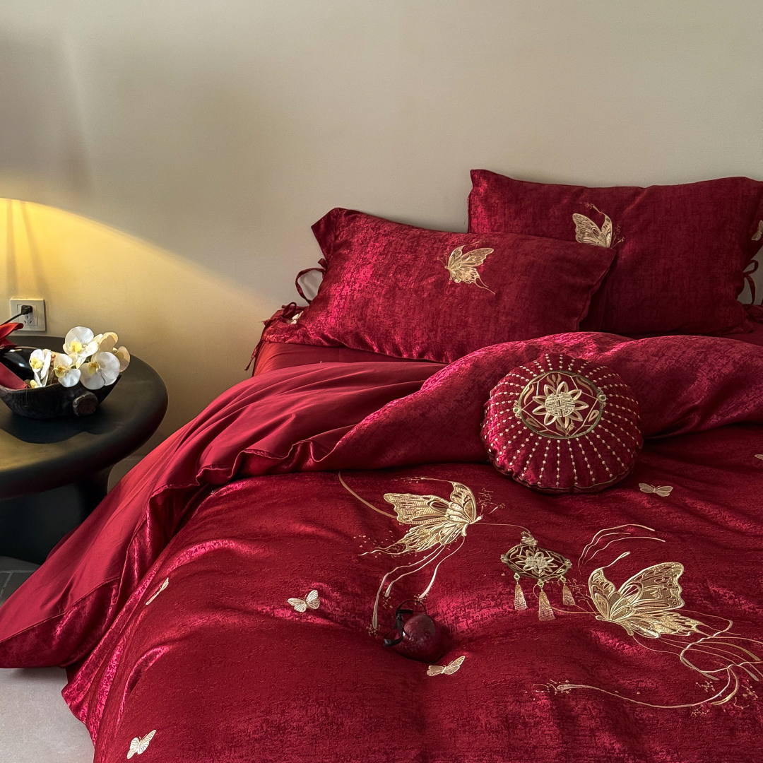 高级感中式长绒棉婚庆四件套大红色蝴蝶刺绣喜被床单结婚床上用品