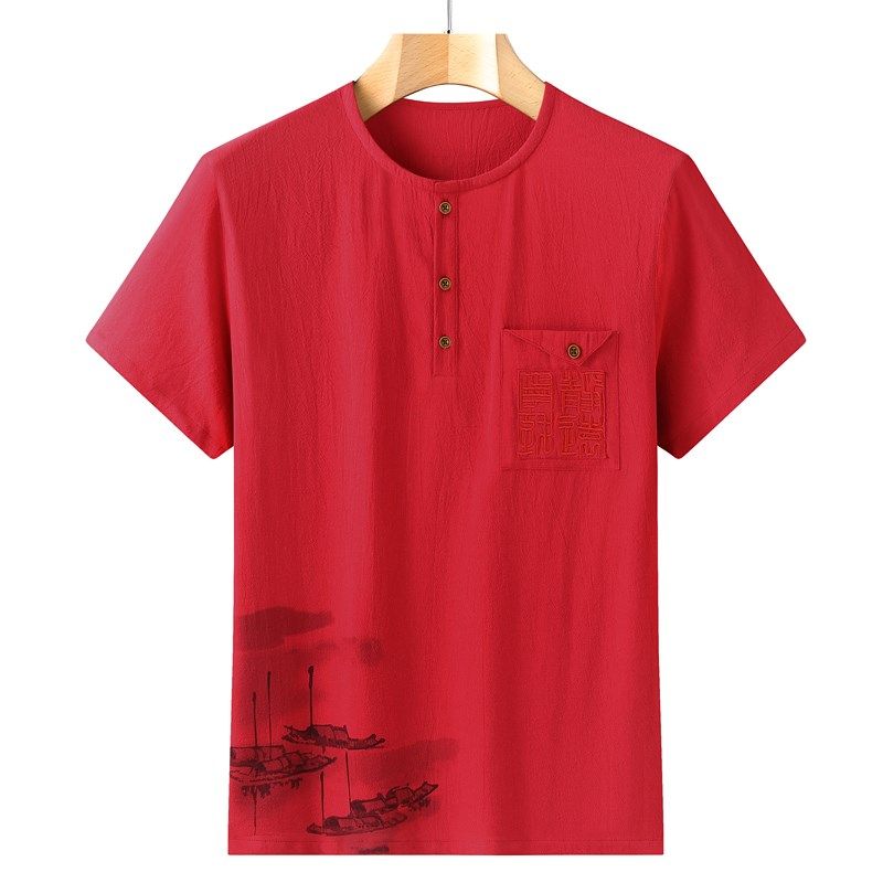 夏季全棉中老年男短袖爷爷爸爸衬衫汉服真口袋红色Tt恤衫唐装上衣