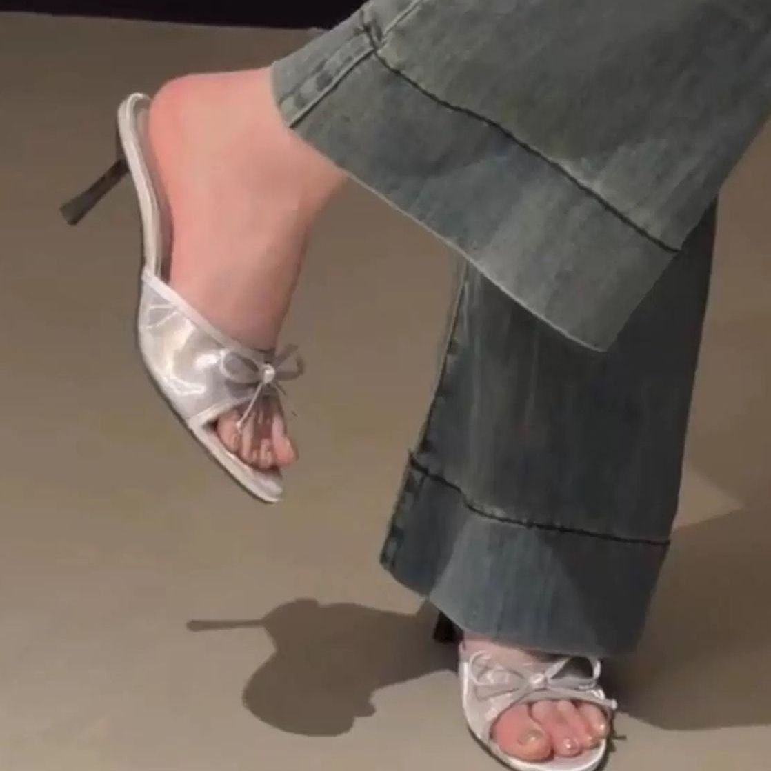 绝美银色圆头蝴蝶结高跟凉鞋女夏季外穿2025新款配裙子细跟凉拖鞋