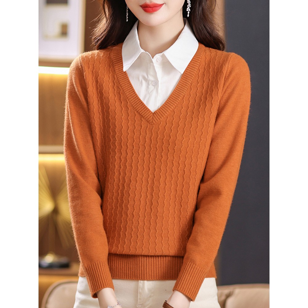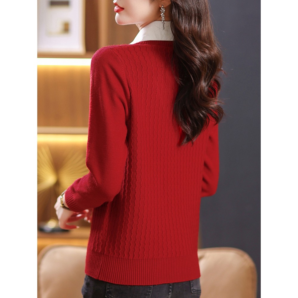 春装新款假两件上衣女时尚洋气宽松衬衫领拼接毛衣针织打底衫春秋