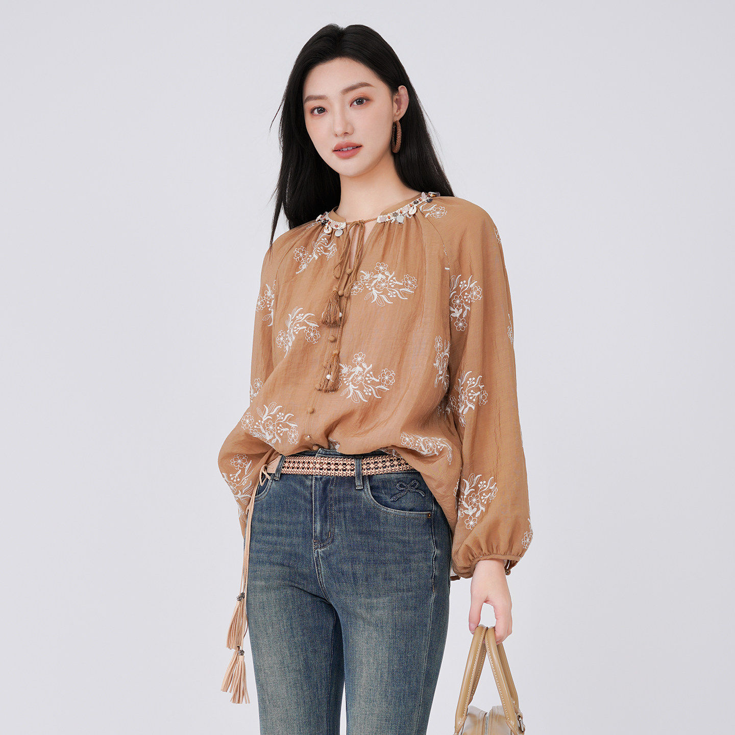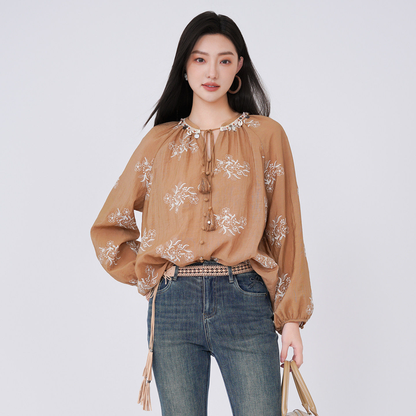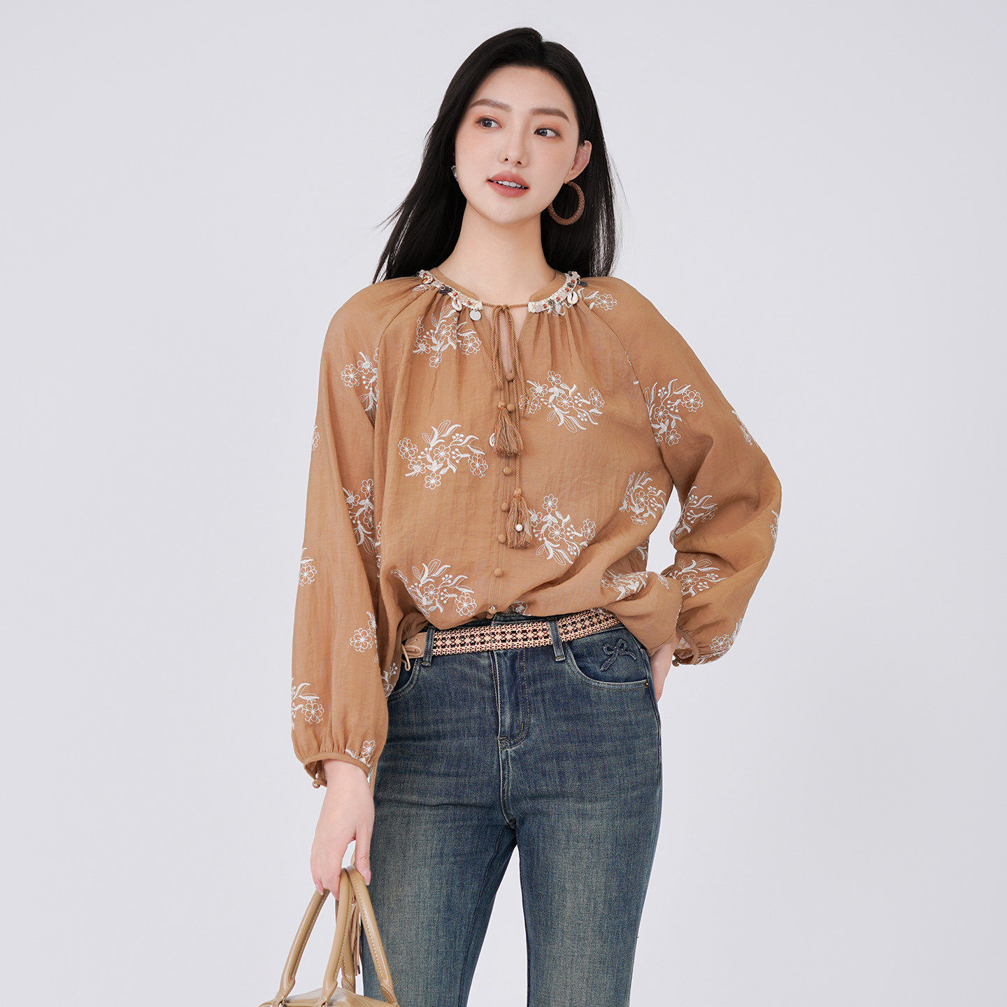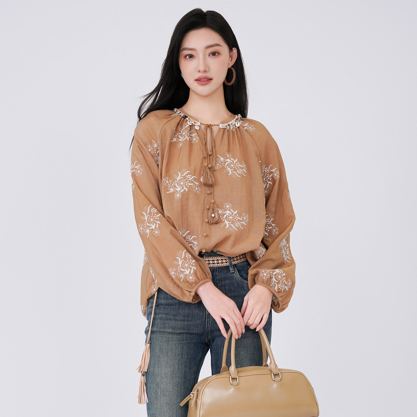 阅涵衬衫长袖2026春季国风灯笼袖复古印花韩版宽松衬衣上衣