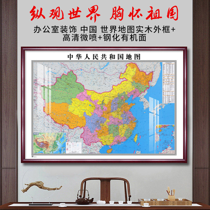 2025新版办公室墙面装饰画中国世界地图挂图带框大尺寸实木壁挂画