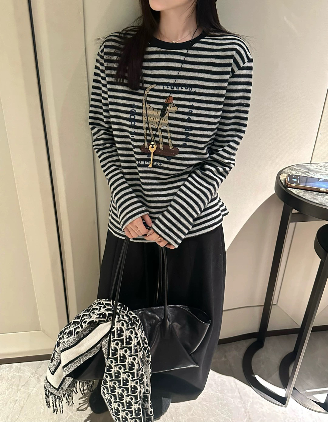 韩伊HANYI正品25冬季保暖卡通印花加厚条纹宽松长袖T恤打底衫女