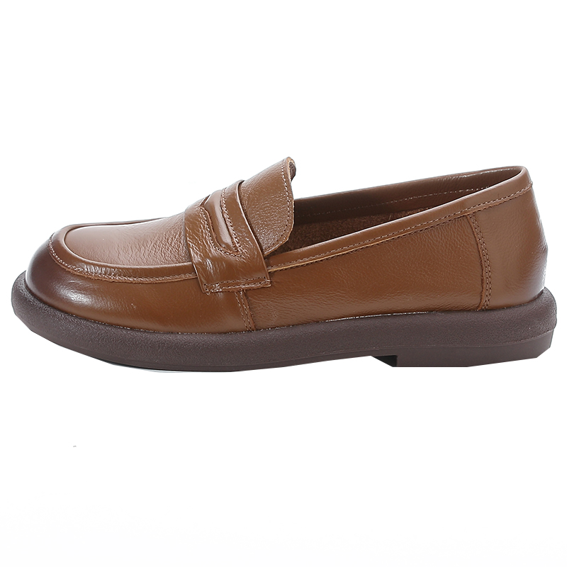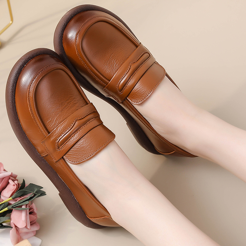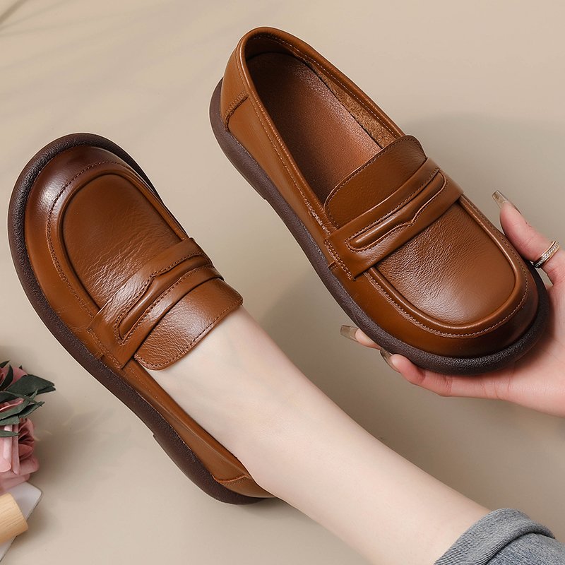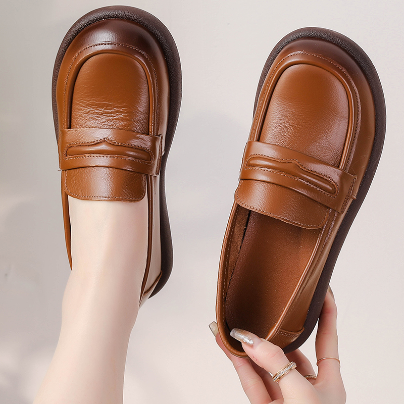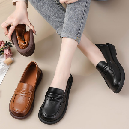 全牛皮春秋款皮鞋女中跟厚底舒适乐福鞋中年妈妈鞋真皮耐磨平底鞋
