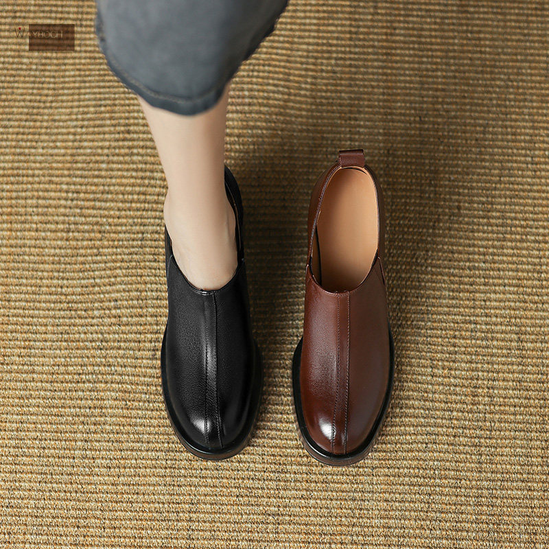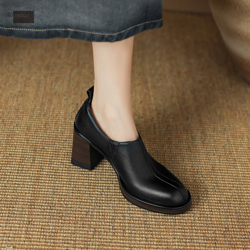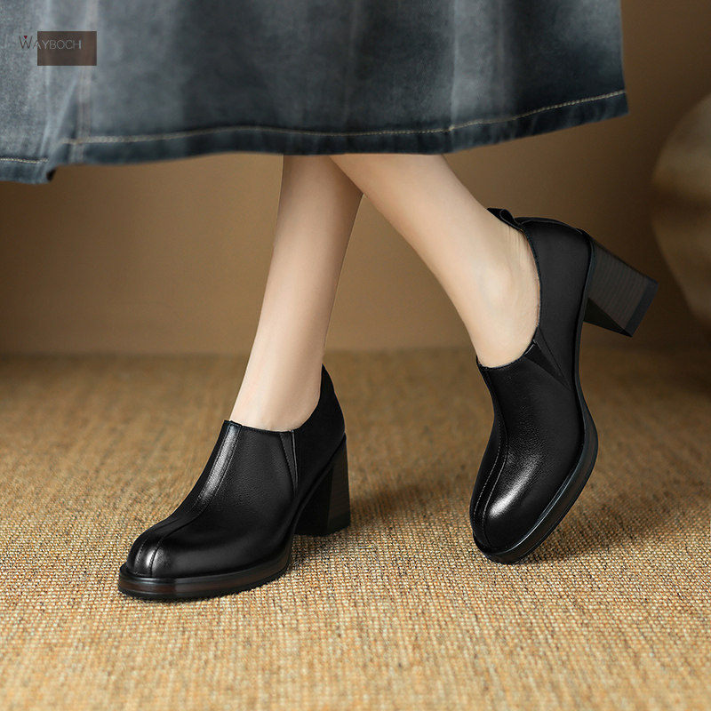 头层牛皮 圆头粗跟高跟鞋女 防水台深口单鞋小皮鞋简约欧美风真皮