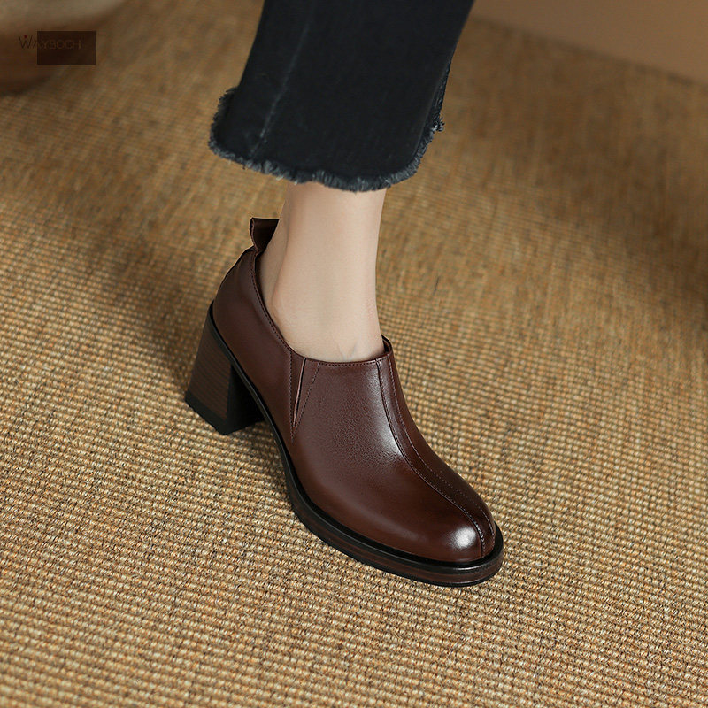 真皮粗跟高跟深口单鞋小皮鞋