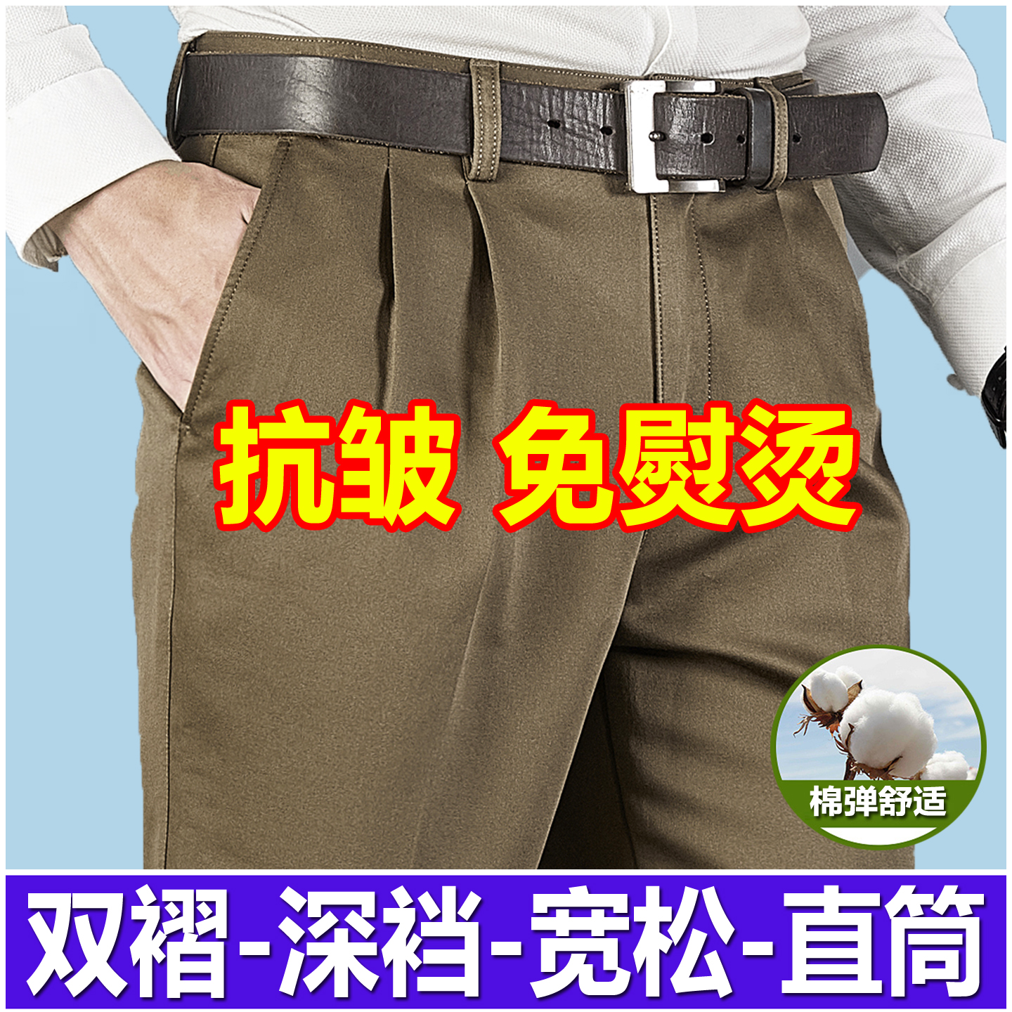 虎都免烫男休闲裤中年直筒宽松秋冬厚款爸爸装中老年深裆双褶男裤